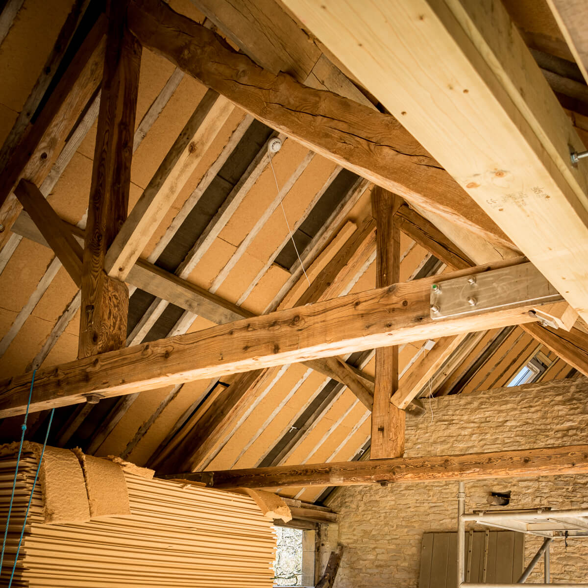 Inside the annex, mechanical and electrical works continue at pace. Original oak trusses are now fully exposed and insulated between rafters, blending traditional character with modern energy performance. The careful integration of new structural elements ensures the historic roofscape remains intact while providing long-term stability.