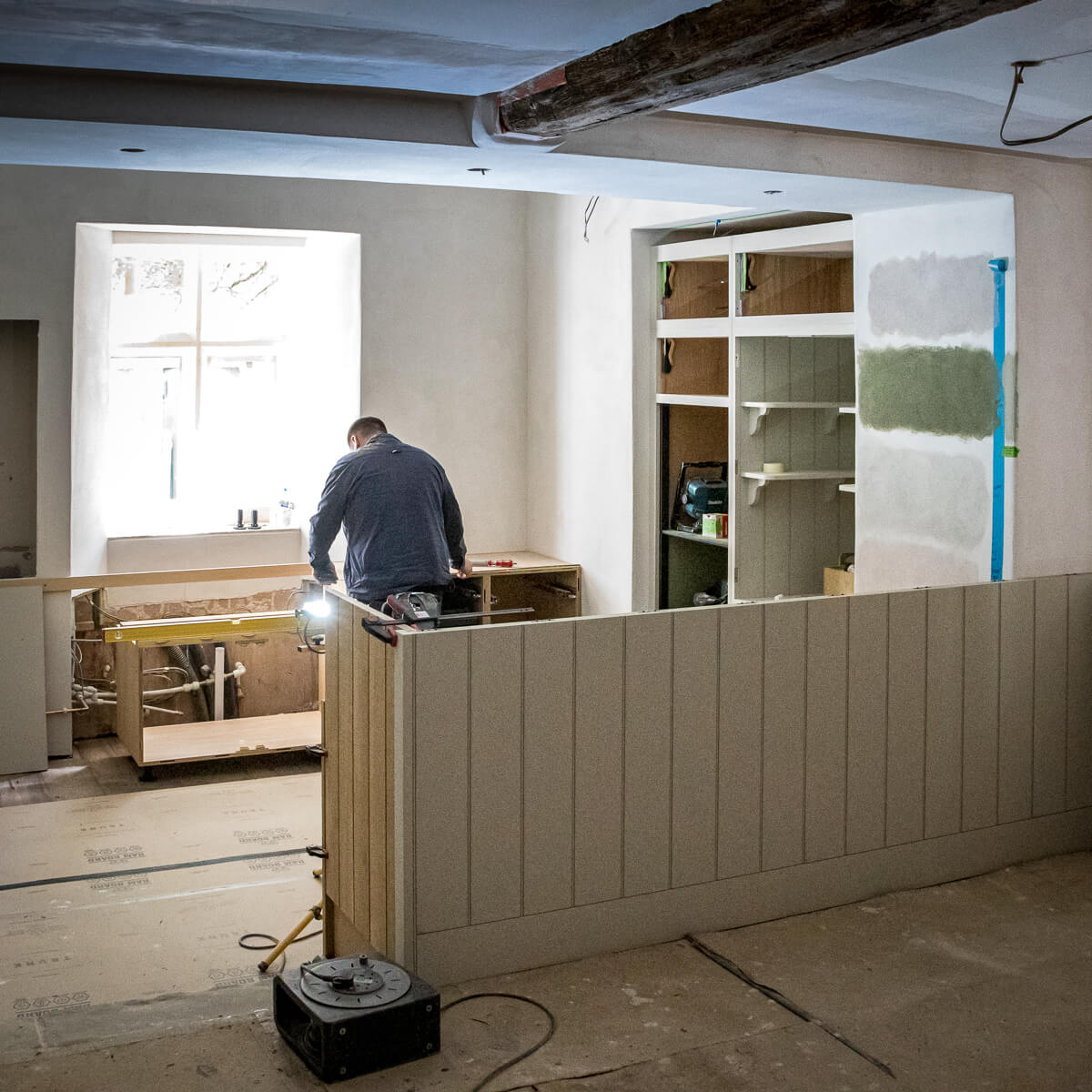 The bespoke kitchen is now being fitted, with solid cabinetry and integrated storage taking shape around the heart of the home. Our joiners are carefully scribing panels into the historic stonework to ensure a flawless fit, blending traditional craftsmanship with modern precision.