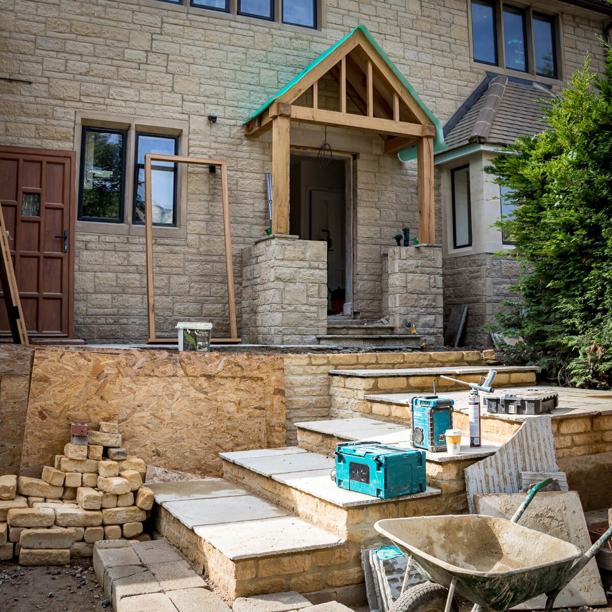 The front elevation has seen major progress, with stone masonry work framing the entrance and a striking bespoke timber porch under construction. Stone steps now lead visitors up to the front door, adding both grandeur and practicality. Around the site, landscaping is advancing, with patios and retaining walls beginning to define the outdoor spaces.
