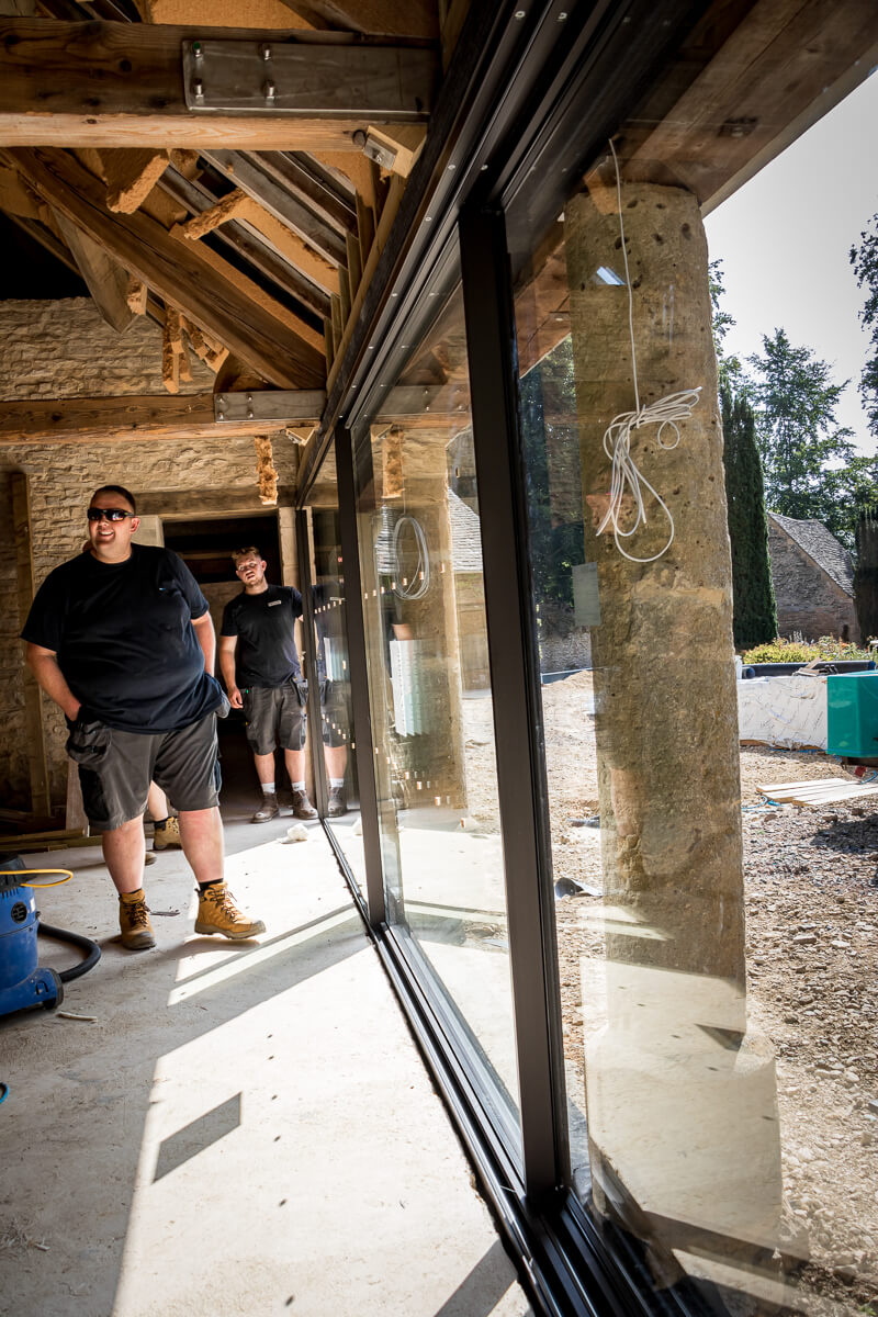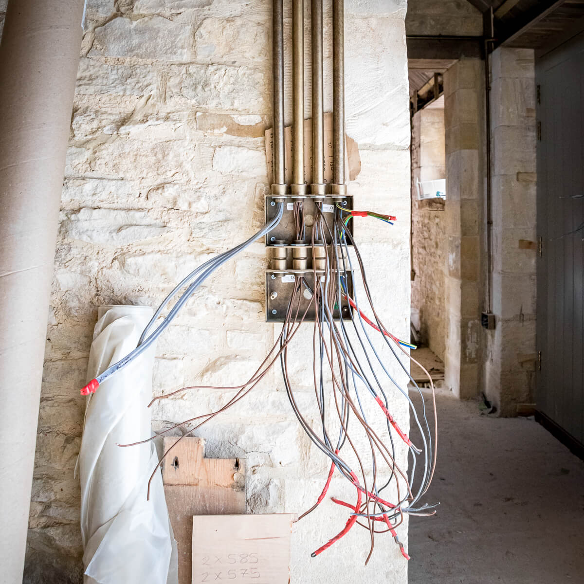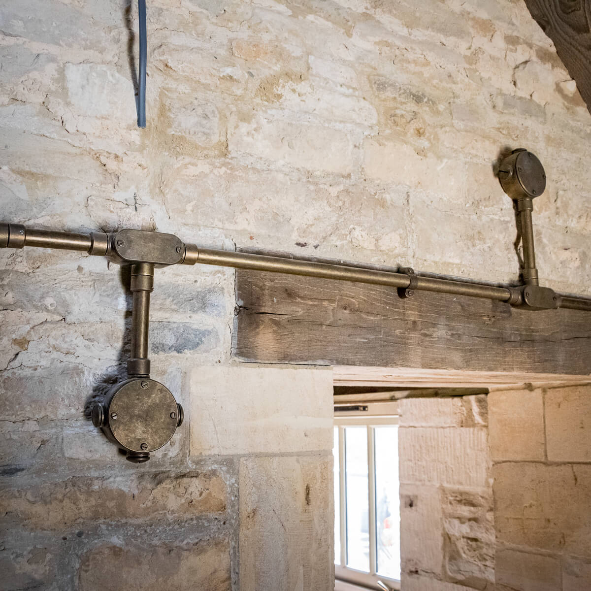 Inside the annex, high-end electrical fittings are being installed, with aged brass conduits and precision junction boxes complementing the rustic Cotswold stone. These details strike the perfect balance between heritage charm and modern luxury.