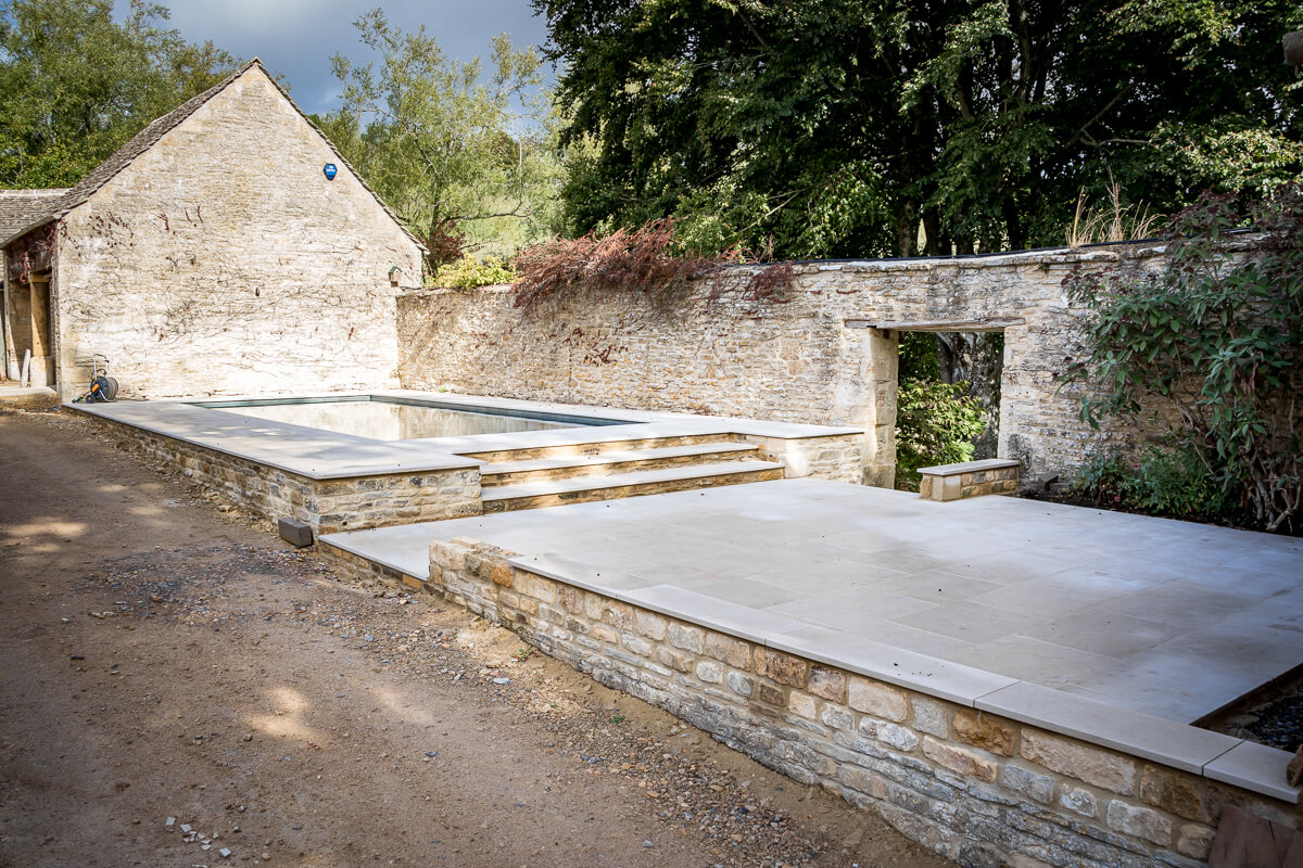 The pool itself has been filled for testing, with systems running as expected. Around it, the relaxation terrace is largely complete, paved in beautifully laid limestone that echoes the tones of the surrounding garden walls. The result is a serene and sophisticated outdoor retreat.