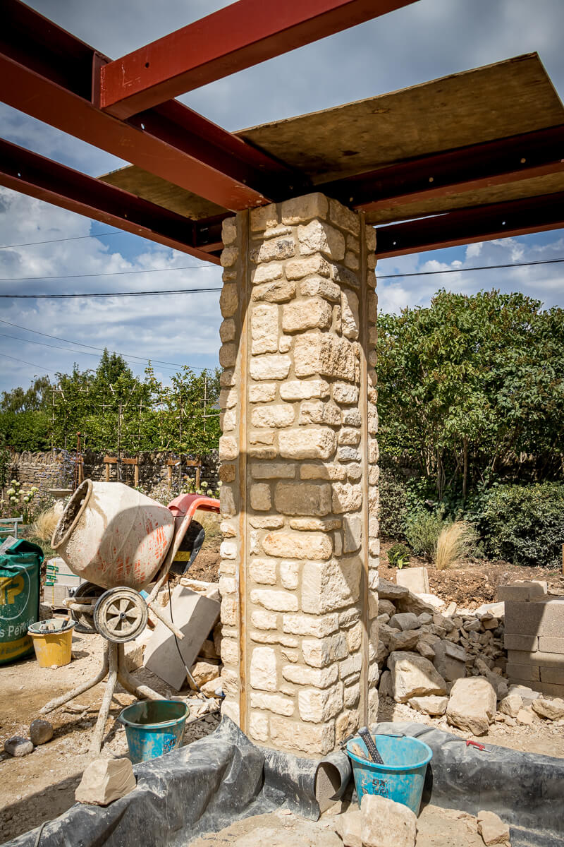 The new extension has taken shape quickly, with the roof structure now in place and preparations underway for the installation of skylights. From the outside, the form of the addition is now clearly defined, seamlessly complementing the original stonework.