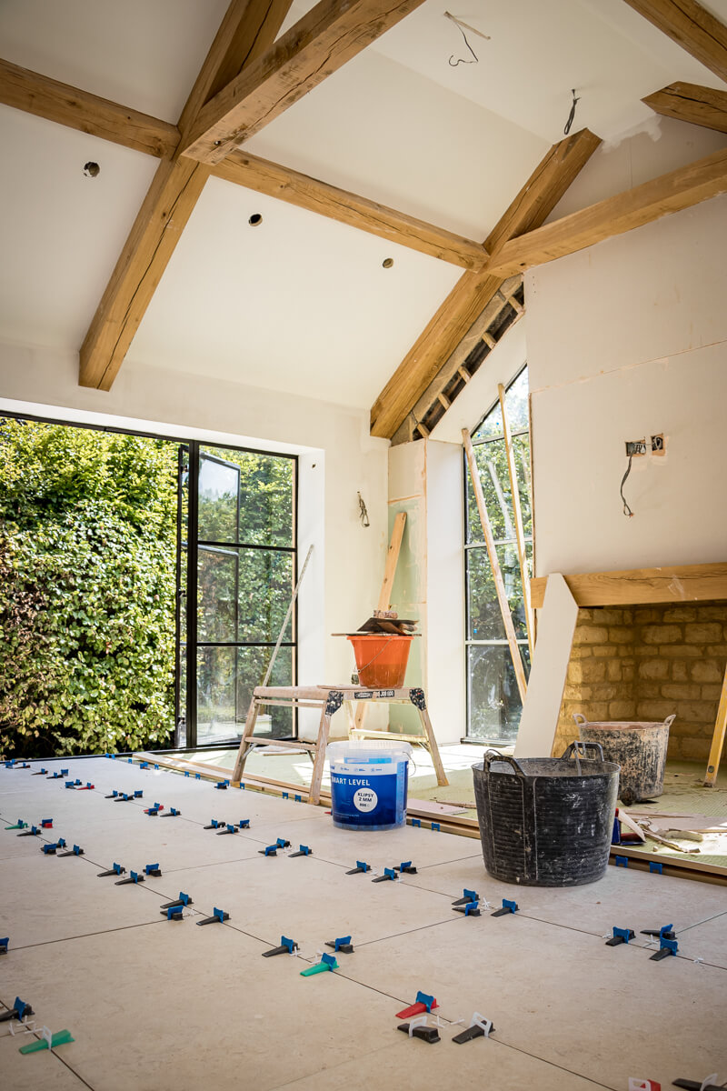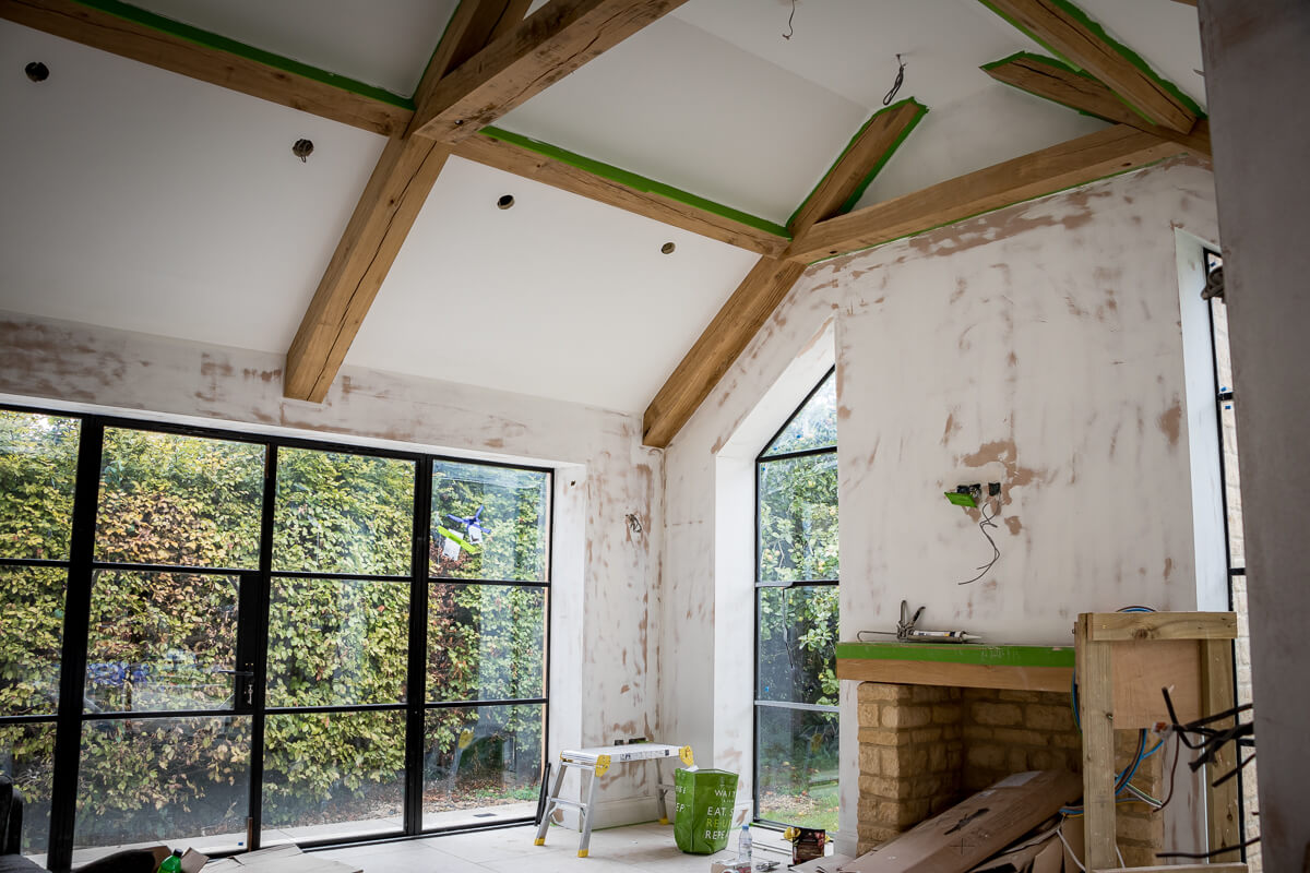 The new extension, with its vaulted ceilings, oak trusses, and expansive glazing, is now fully plastered and awaiting final decoration. Externally, the façade and rooflines are complete, giving the home a timeless and beautifully balanced appearance.