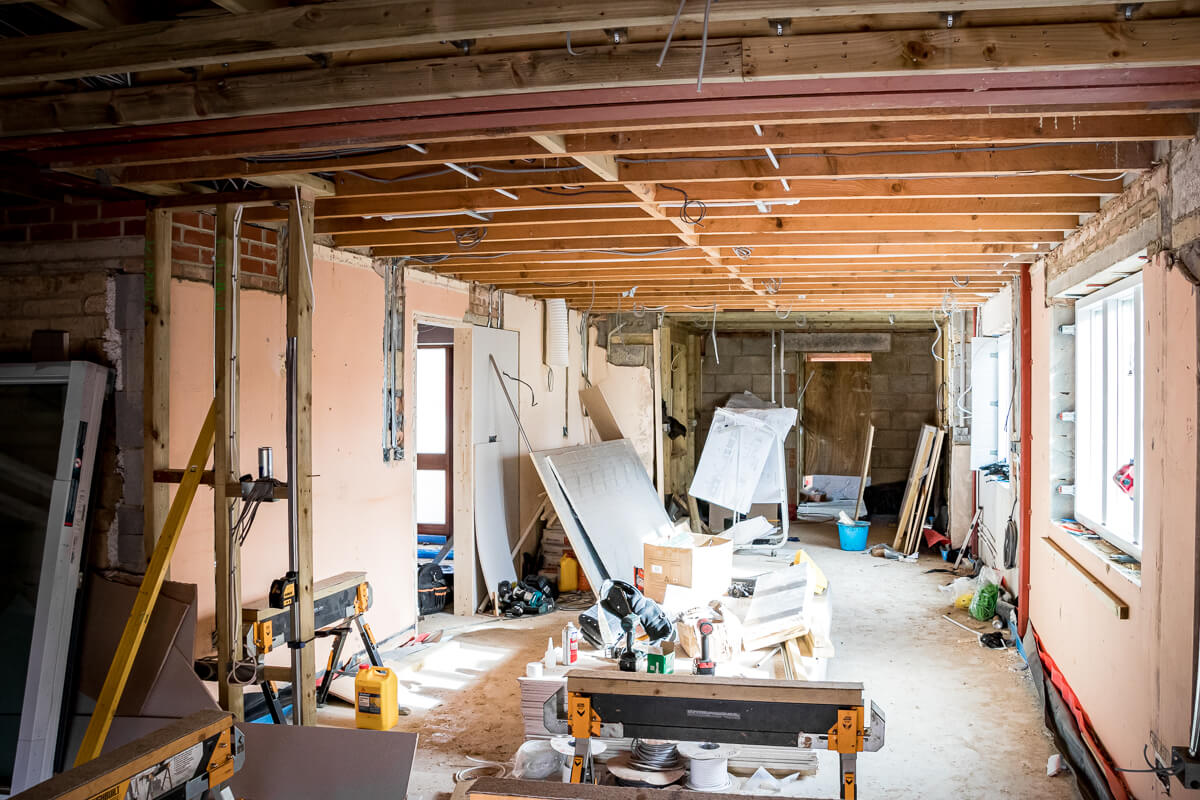 Internally, the new floor plan is becoming tangible as stud walls are erected to define the redefined living spaces. We are currently constructing a new walk-in shower suite and separating the primary ground-floor areas to improve the home’s flow. Insulation is also being meticulously fitted around new window openings, a critical detail for the thermal efficiency and comfort of this contemporary renovation.