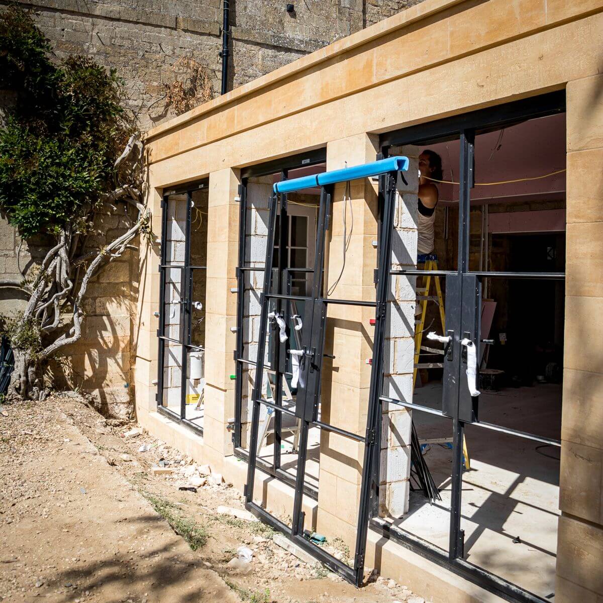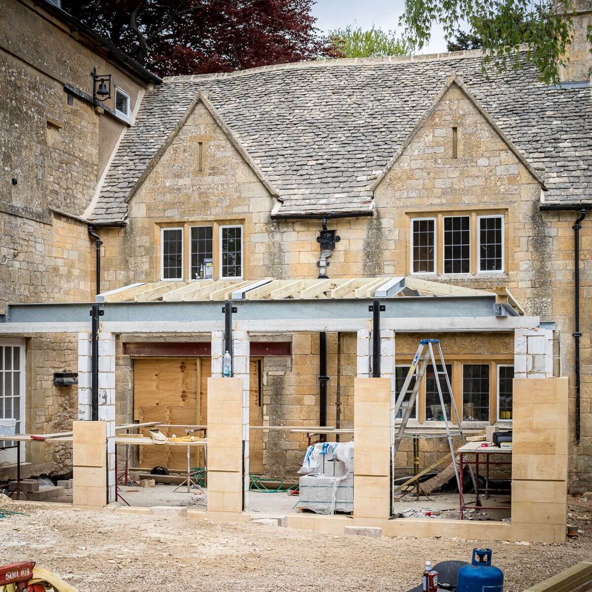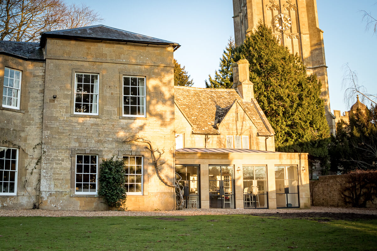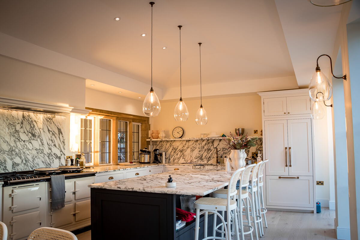 One of the centrepieces of the renovation is the bespoke single-storey kitchen extension: a glass-fronted, Cotswold stone structure filled with light and warmth. Custom cabinetry, marble worktops, and slim-framed glazing come together to create a space that’s both contemporary and timeless, allowing modern family life to unfold comfortably within the context of a historic building.