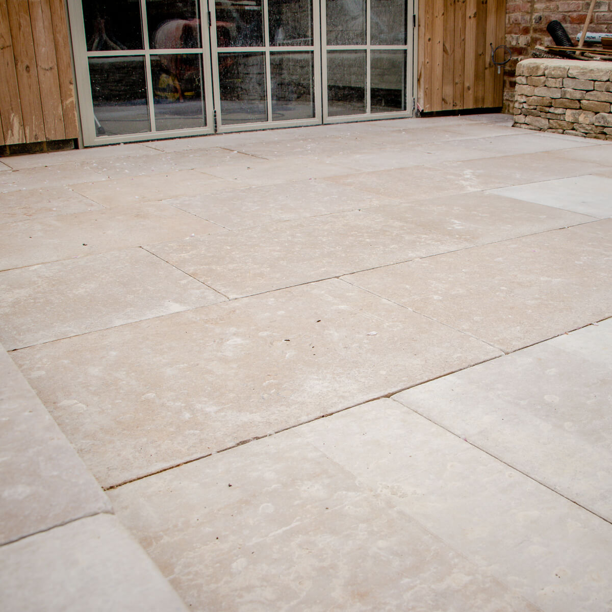 Timber cladding now embraces the extension and adds warmth and character to the new structure. Patio doors have been fitted and lead to the newly completed patio. Including a Cotswold stone raised flower bed to add a touch of rustic charm