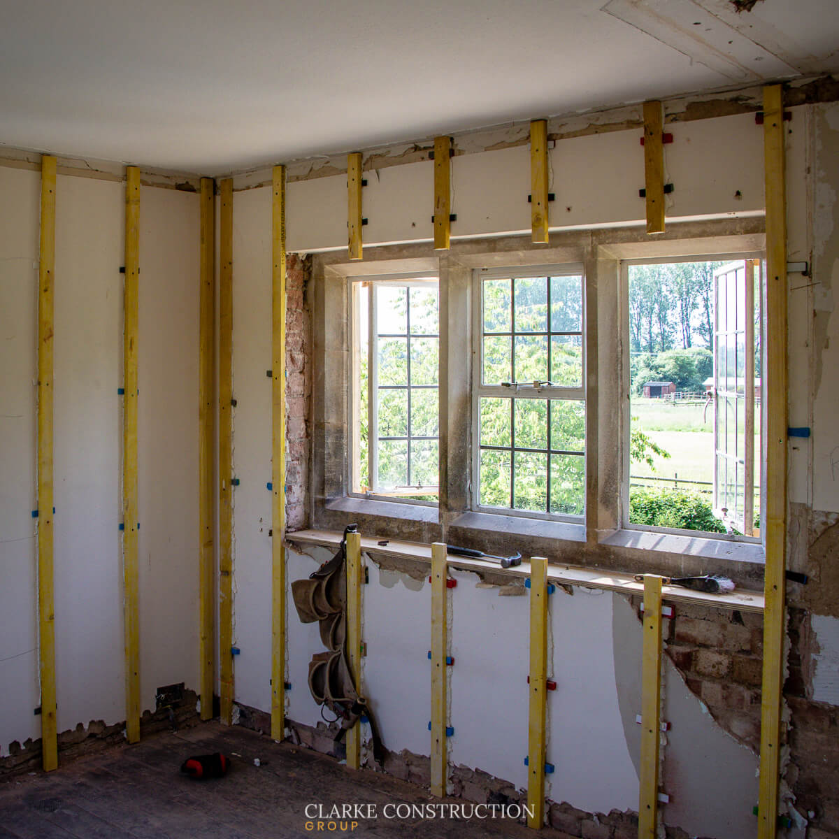 Inside the existing building has been gutted. New stud work is marking out the new spaces and stud work on the walls is in place ready for the eventual plasterboard.