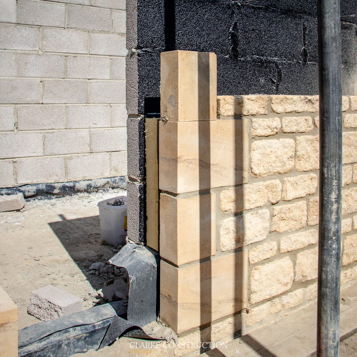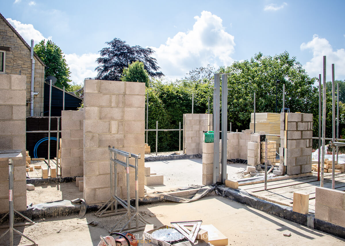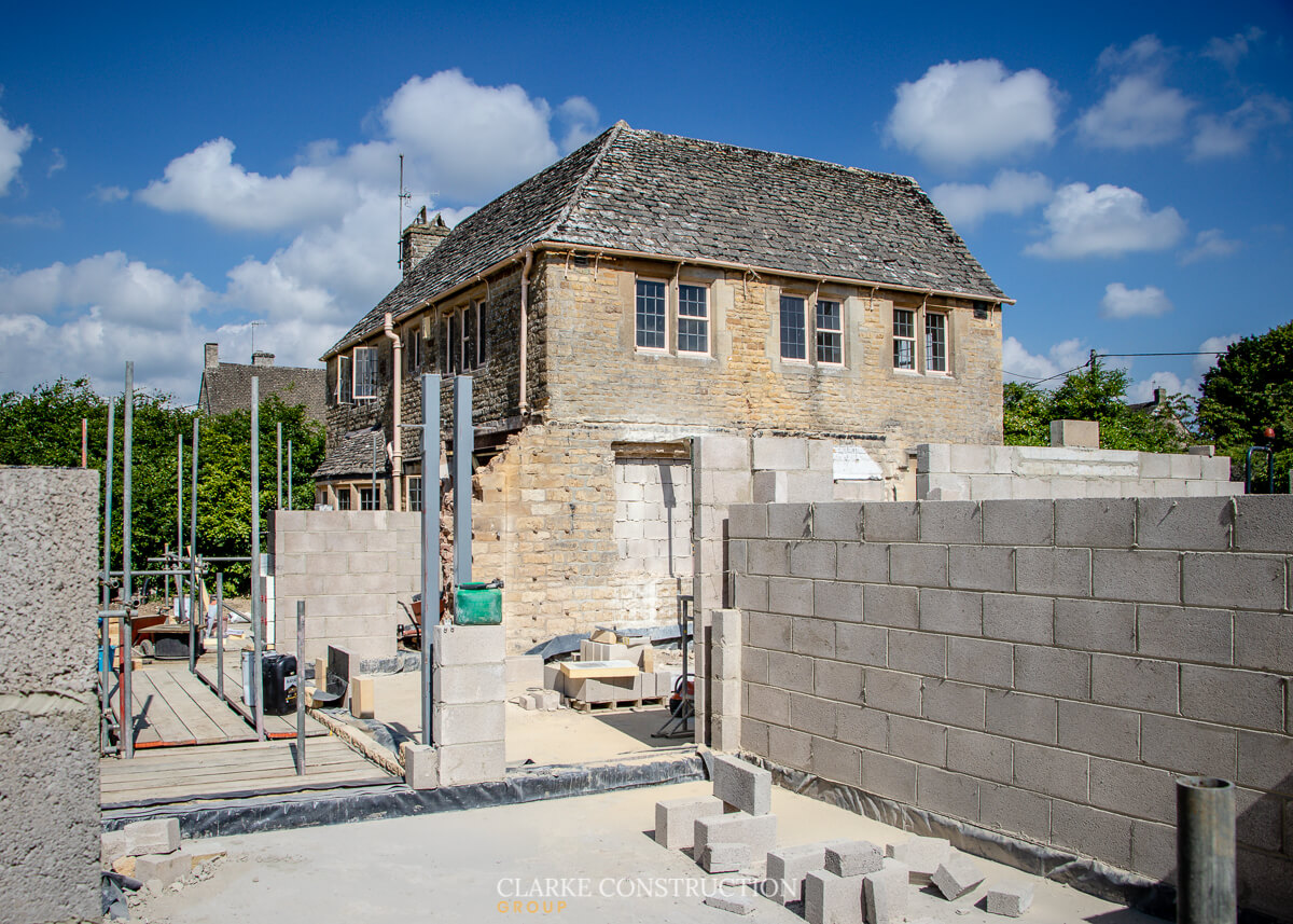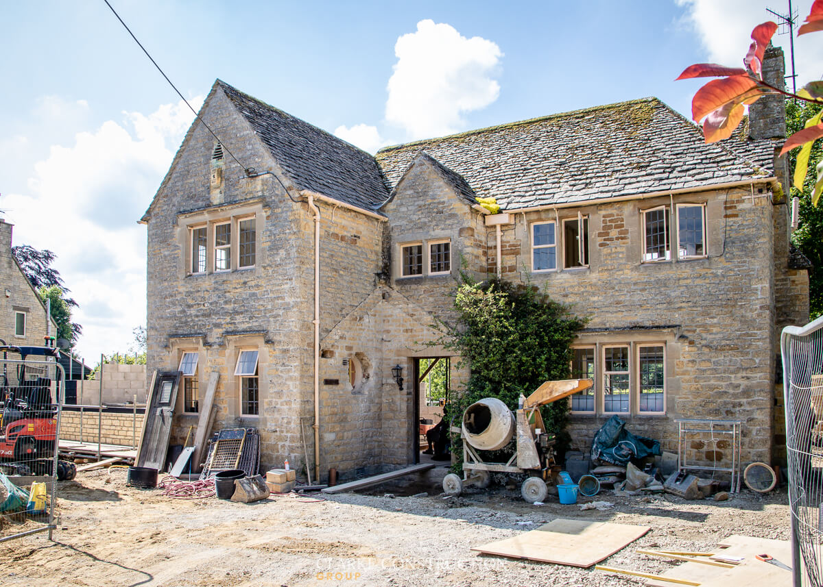 Outside with the sizable extension, the block and cotswold stone work continues to rise vertical on top of the foundations