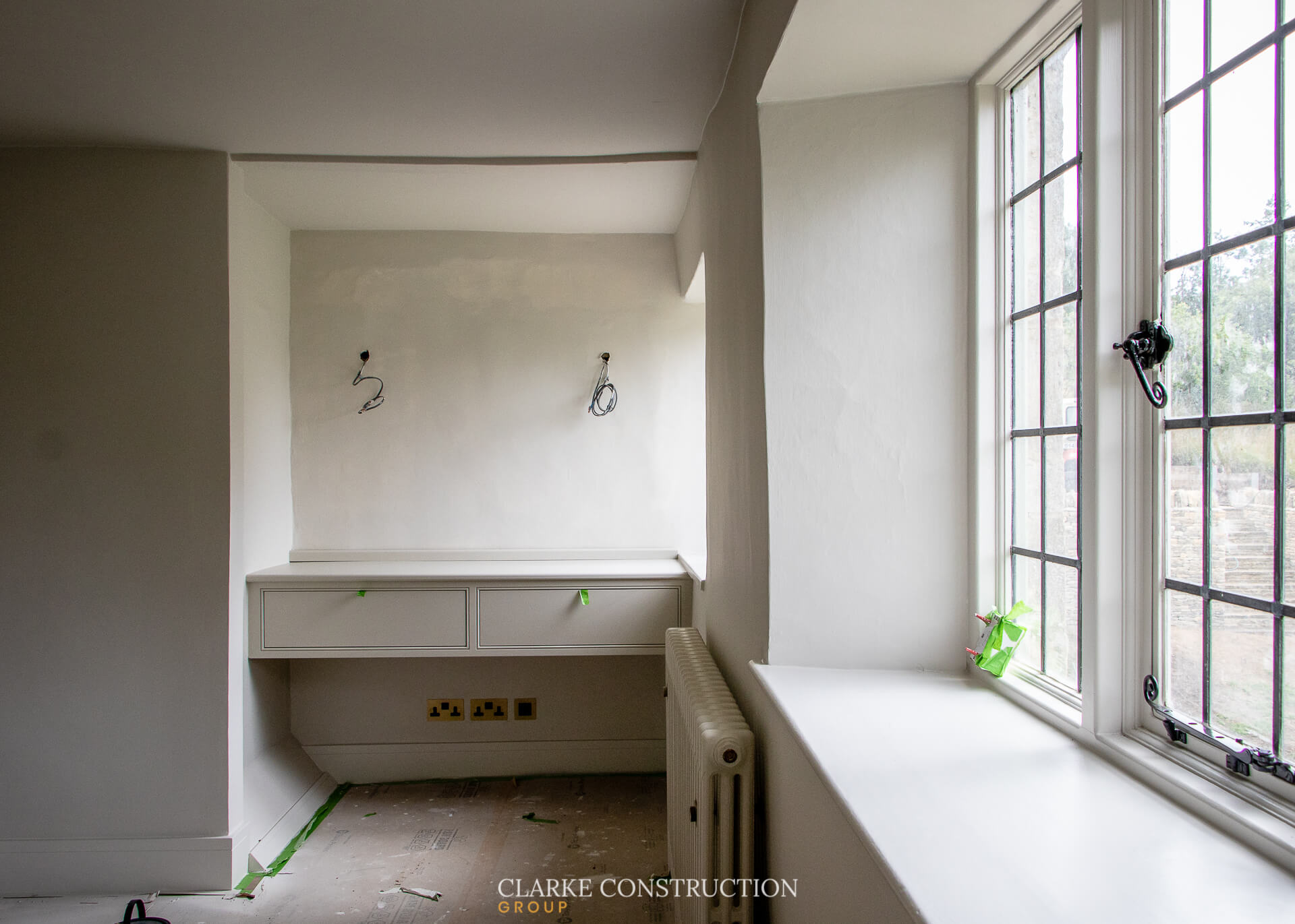 Our in-house joinery team is crafting bespoke elements throughout the manor, including a full kitchen, bathroom vanity units, bookcases, and a practical yet elegant boot room. Their craftsmanship is evident in every detail, adding a personalised touch to the home's interior.