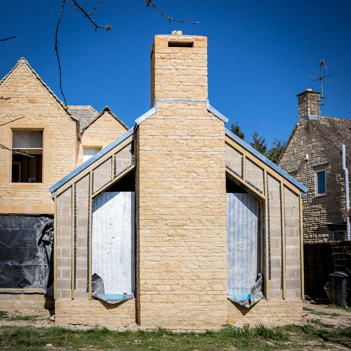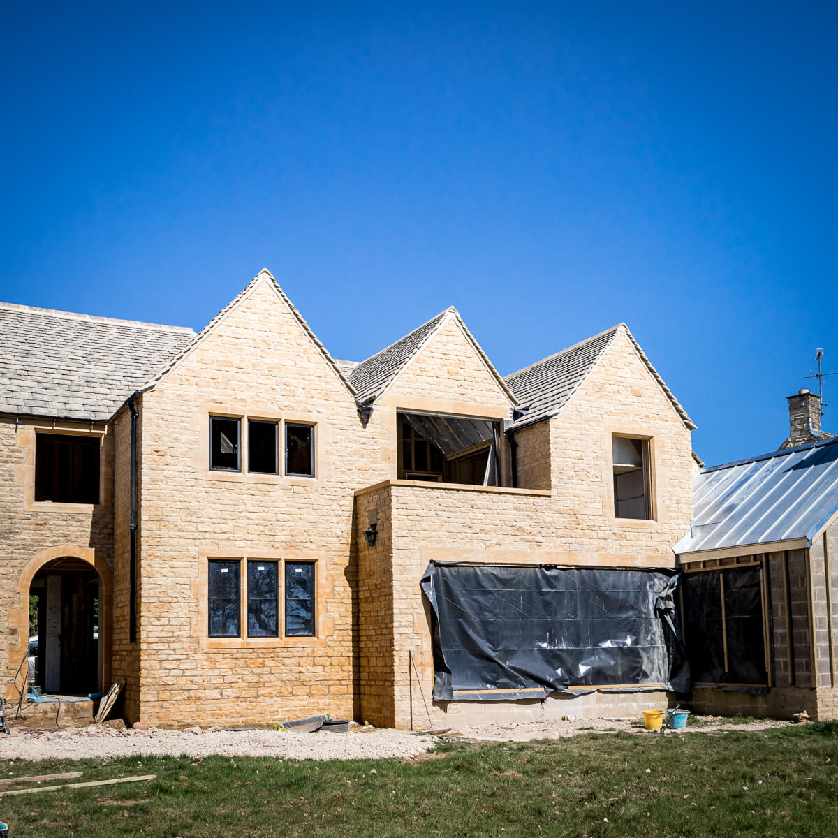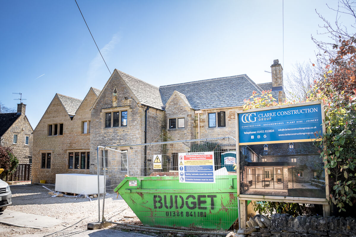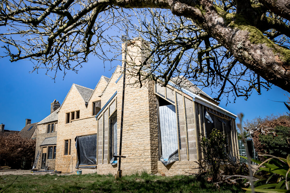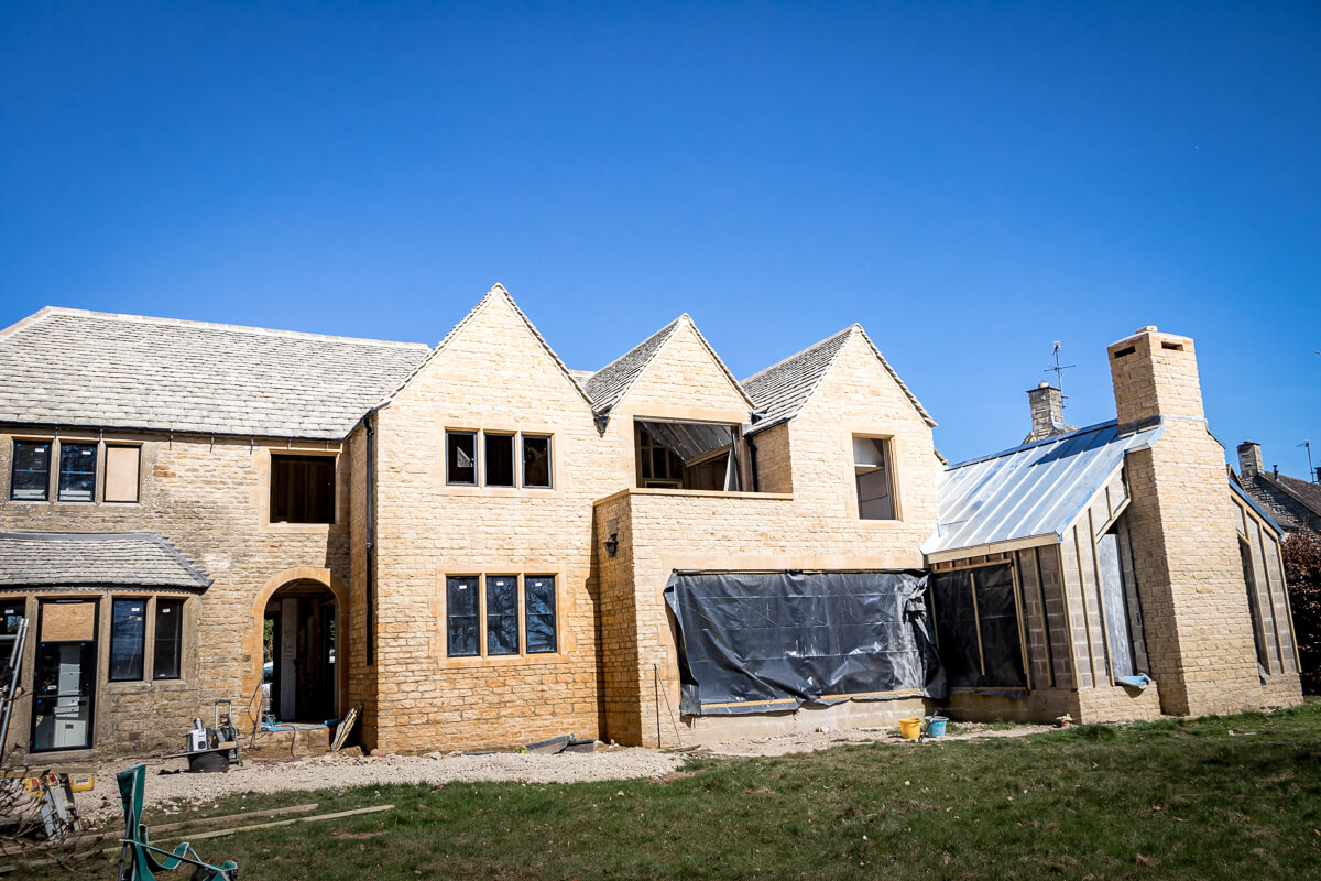 With the scaffolding now down, you can really appreciate the expanded footprint and new architectural features that have been carefully crafted in beautiful Cotswold stone. The new chimney stack is standing tall, and the master suite balcony has been revealed—both perfectly echoing the existing character of the original building while adding fresh elegance and scale.