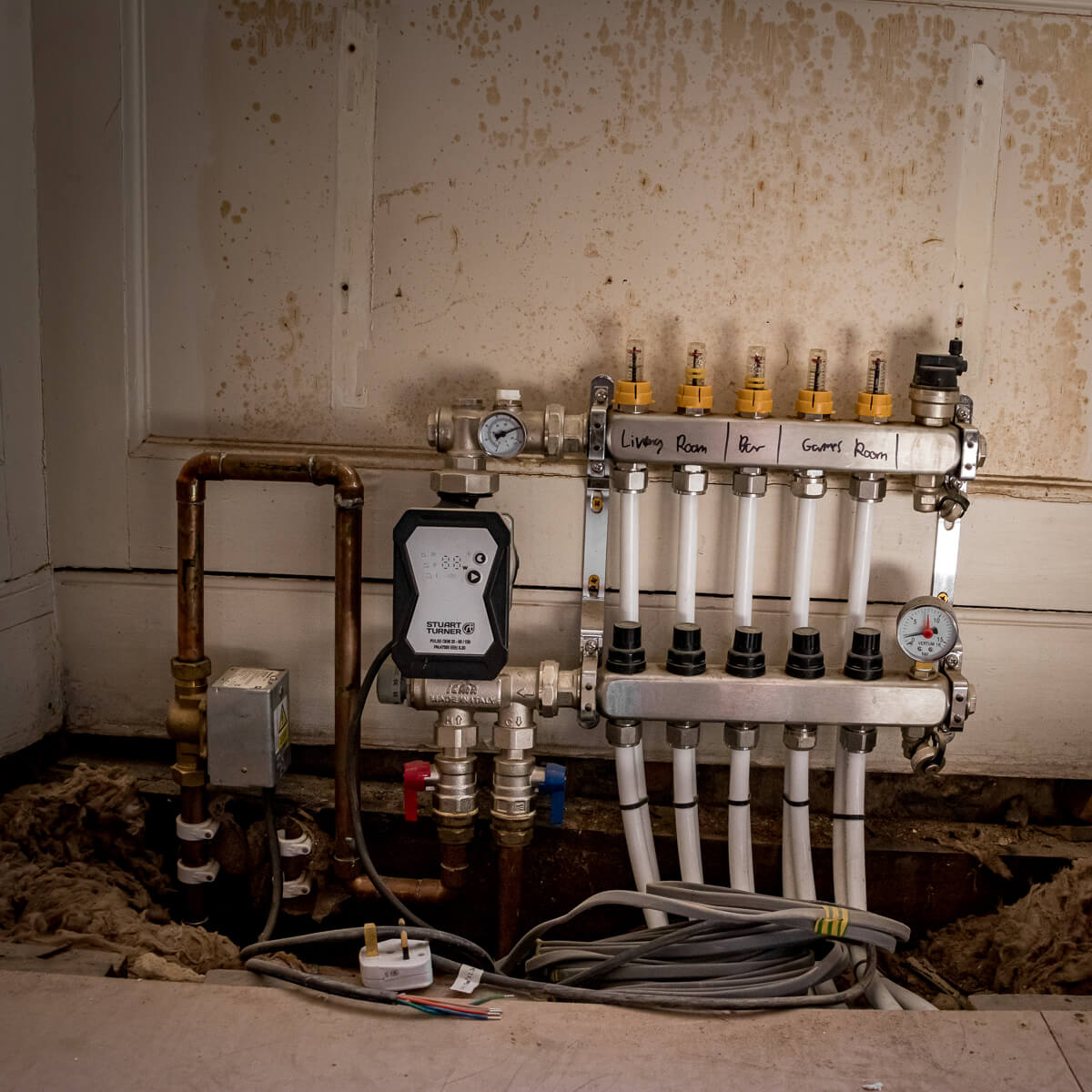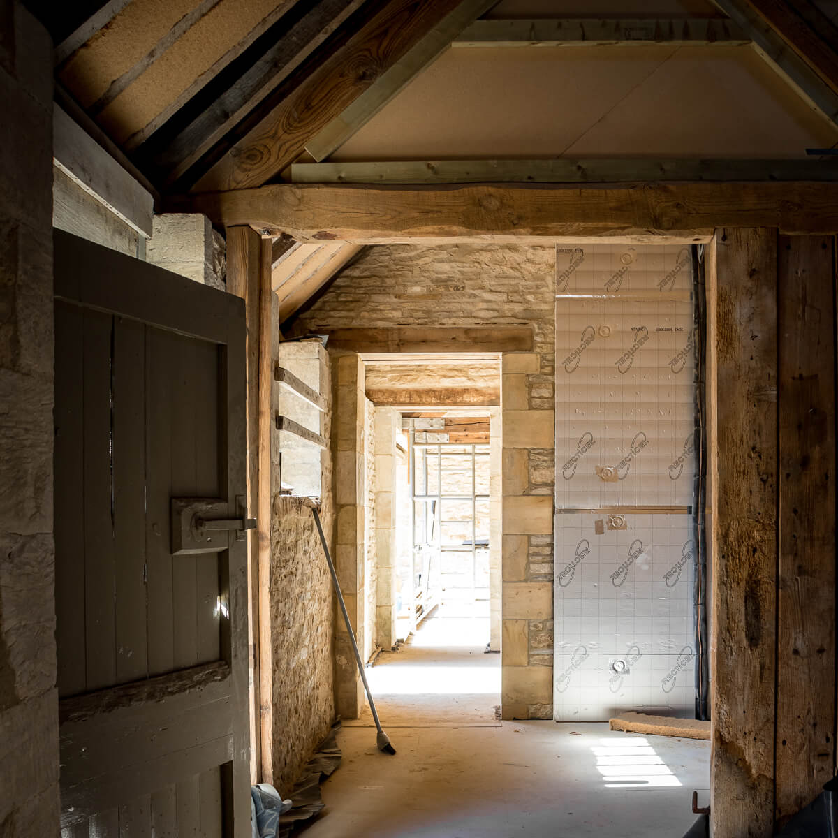 Inside the annex, mechanical and electrical works continue at pace. Original oak trusses are now fully exposed and insulated between rafters, blending traditional character with modern energy performance. The careful integration of new structural elements ensures the historic roofscape remains intact while providing long-term stability.