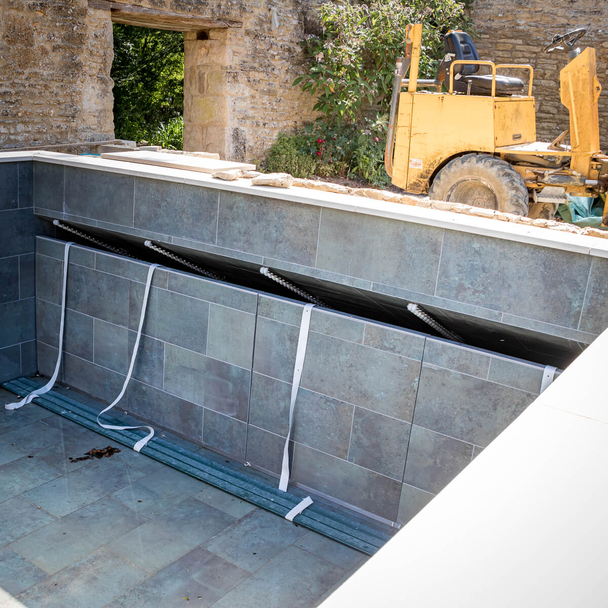 In the spa annex, the swimming pool is now largely complete. The tiled interior, mechanical systems, and finishing touches are coming together, ready to provide the perfect centrepiece for this private retreat.