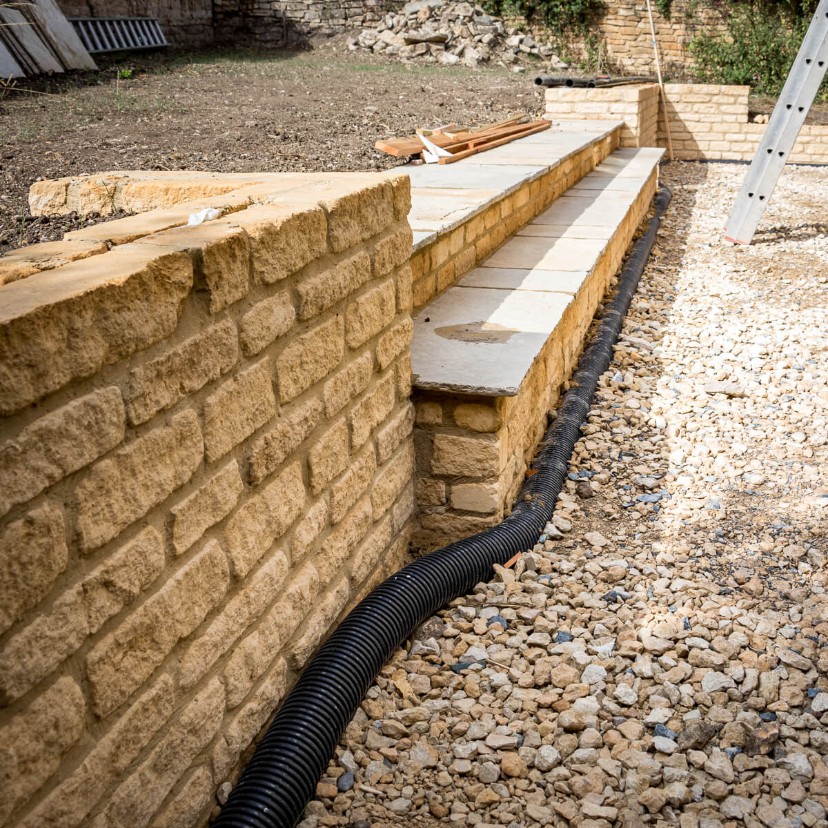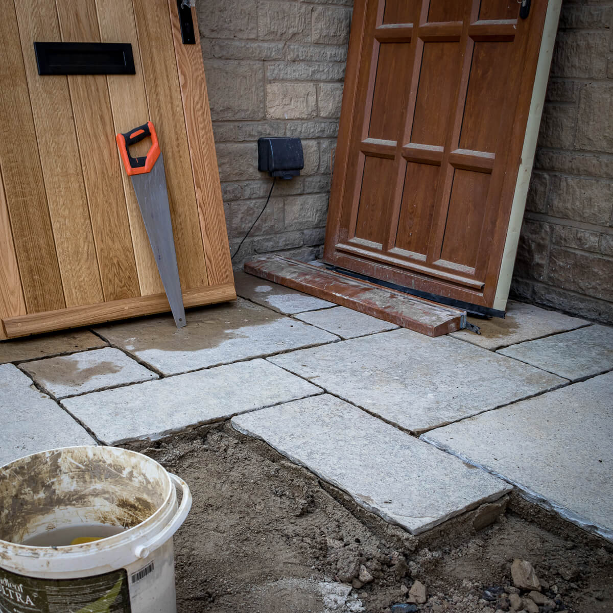 The front elevation has seen major progress, with stone masonry work framing the entrance and a striking bespoke timber porch under construction. Stone steps now lead visitors up to the front door, adding both grandeur and practicality. Around the site, landscaping is advancing, with patios and retaining walls beginning to define the outdoor spaces.