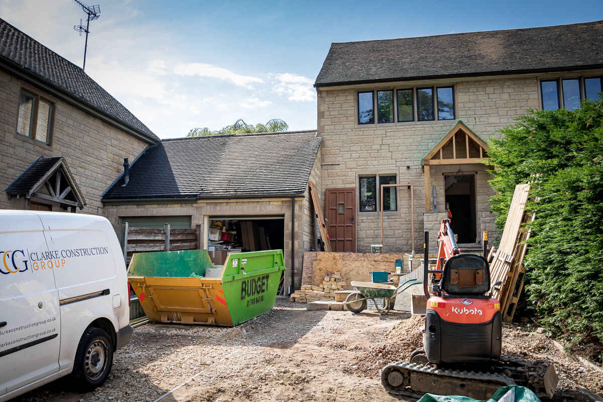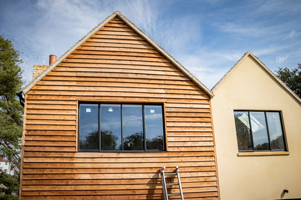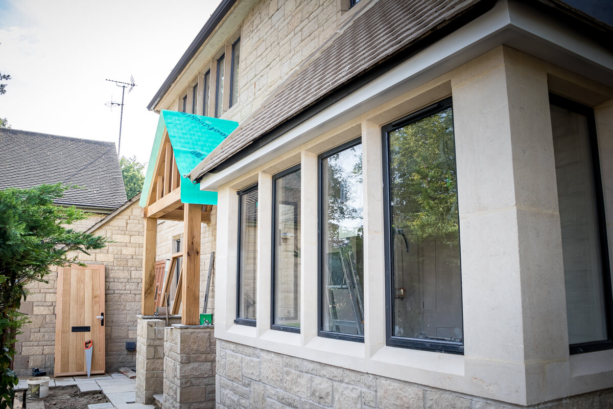 Externally, the two-storey extension is complete, clad in beautiful timber and paired with sleek black steel windows that give a contemporary edge to the Cotswold stonework. The newly built stone chimney breast stands proudly, anchoring the design in traditional character while complementing the modern elements.