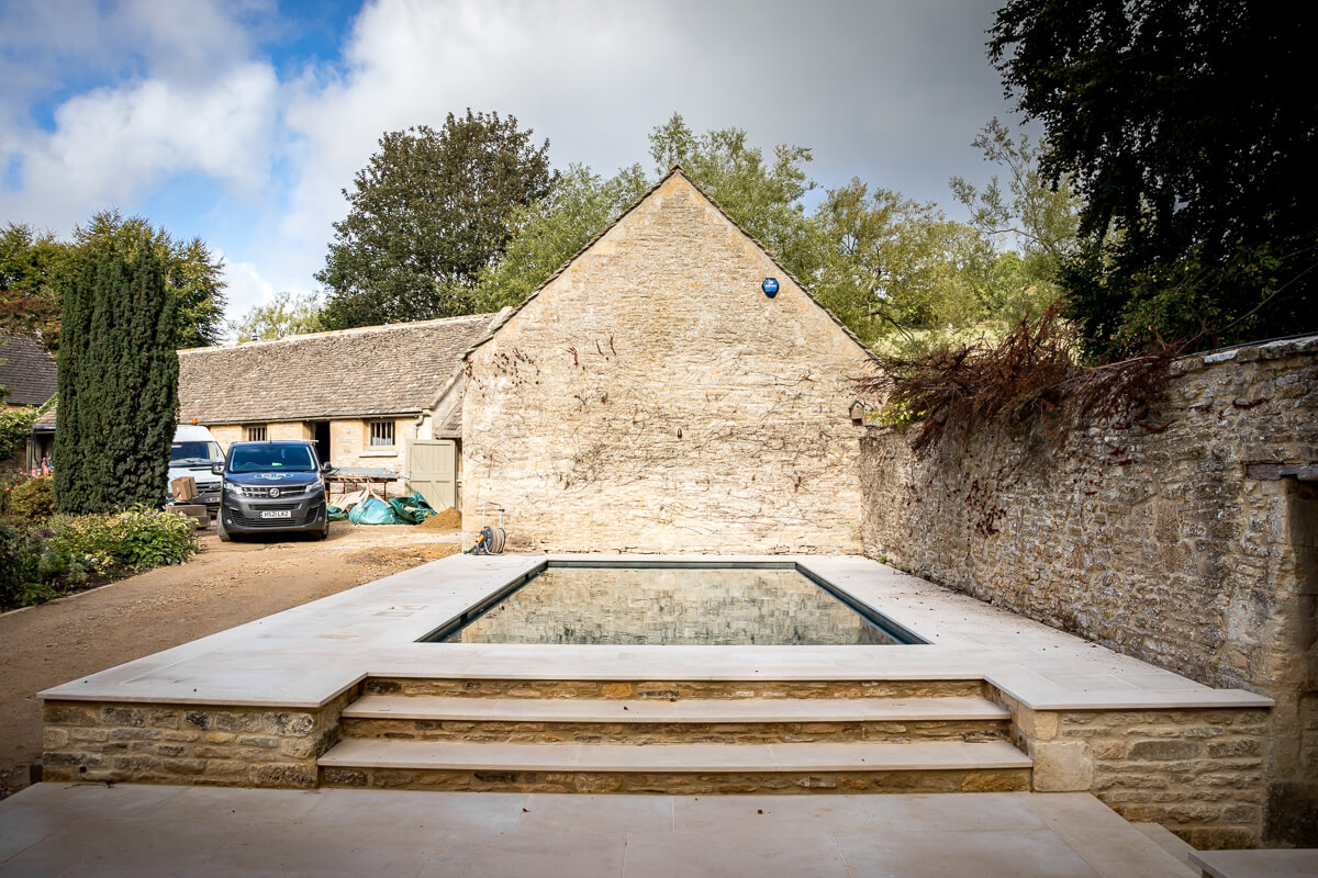 The pool itself has been filled for testing, with systems running as expected. Around it, the relaxation terrace is largely complete, paved in beautifully laid limestone that echoes the tones of the surrounding garden walls. The result is a serene and sophisticated outdoor retreat.