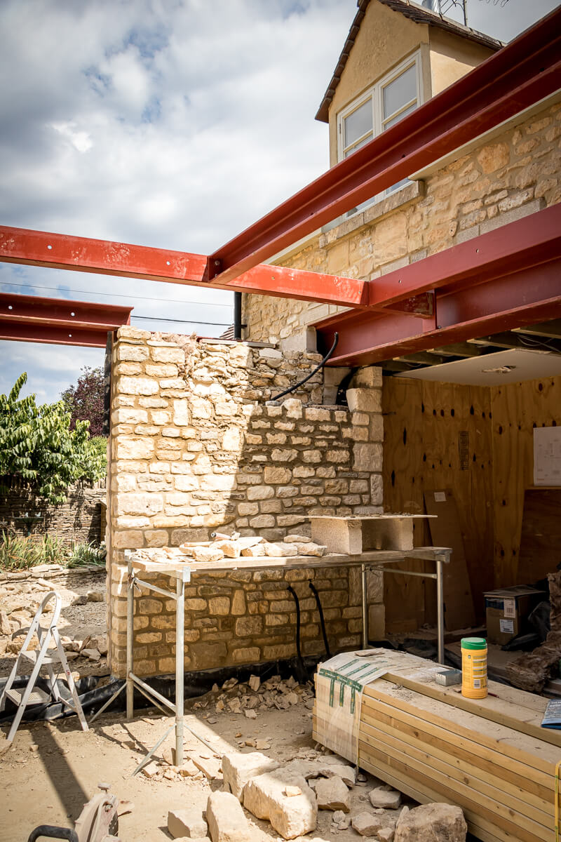 The new extension has taken shape quickly, with the roof structure now in place and preparations underway for the installation of skylights. From the outside, the form of the addition is now clearly defined, seamlessly complementing the original stonework.