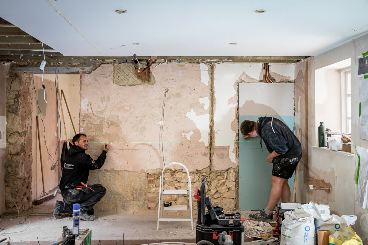 Elsewhere, work is in full swing throughout the property. The electrical team are carrying out first fix installations, while tilers, plasterers, and plumbers tackle their respective areas.