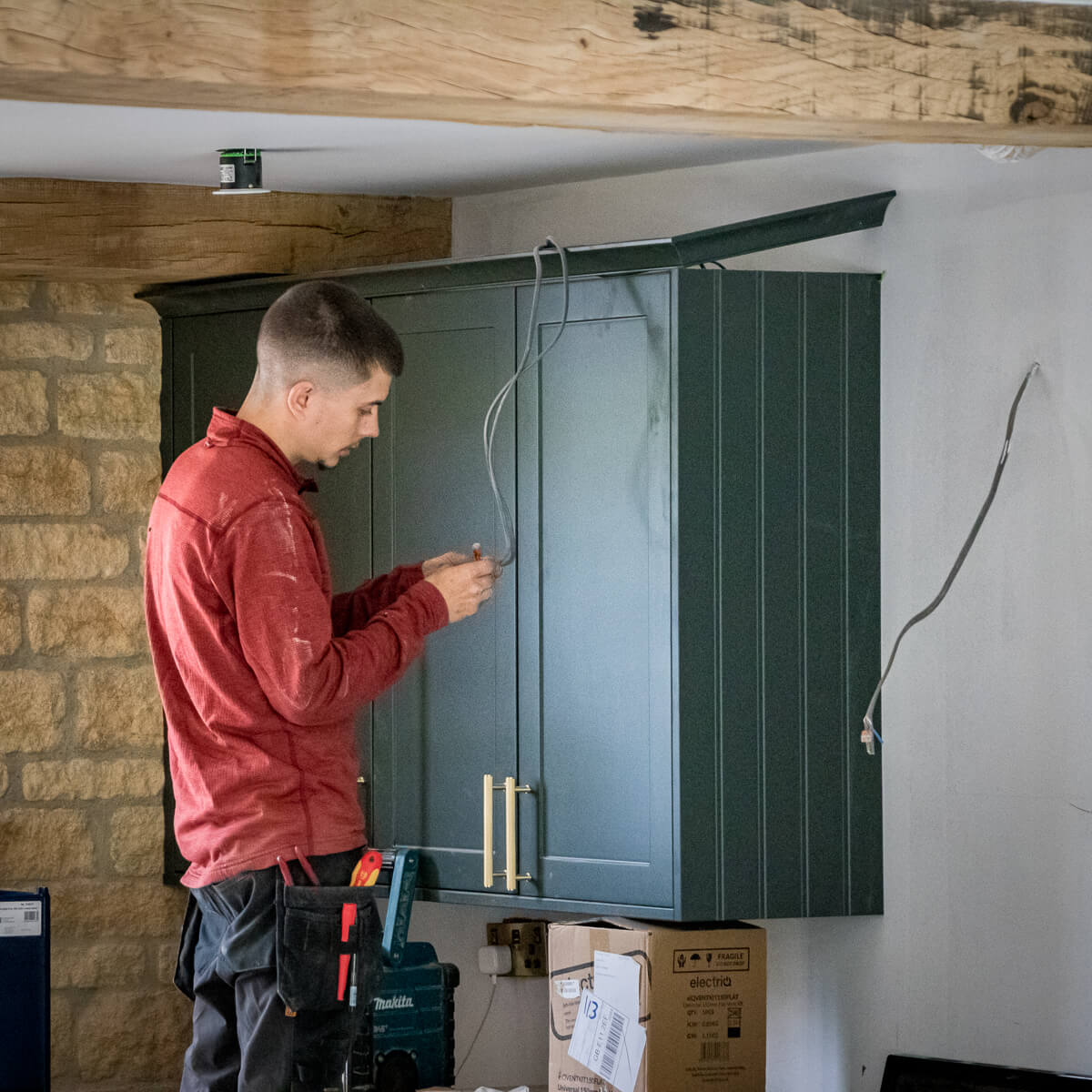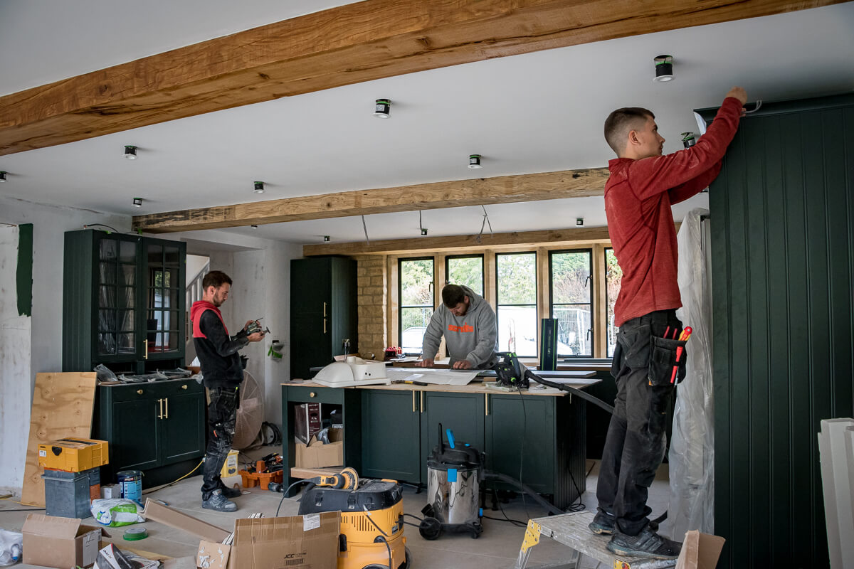 The kitchen installation is well underway, featuring deep green cabinetry with brushed brass handles and solid timber worktops that perfectly complement the exposed beams and Cotswold stone walls. With appliances and lighting being connected, this heart of the home is nearly ready for its first meal.
