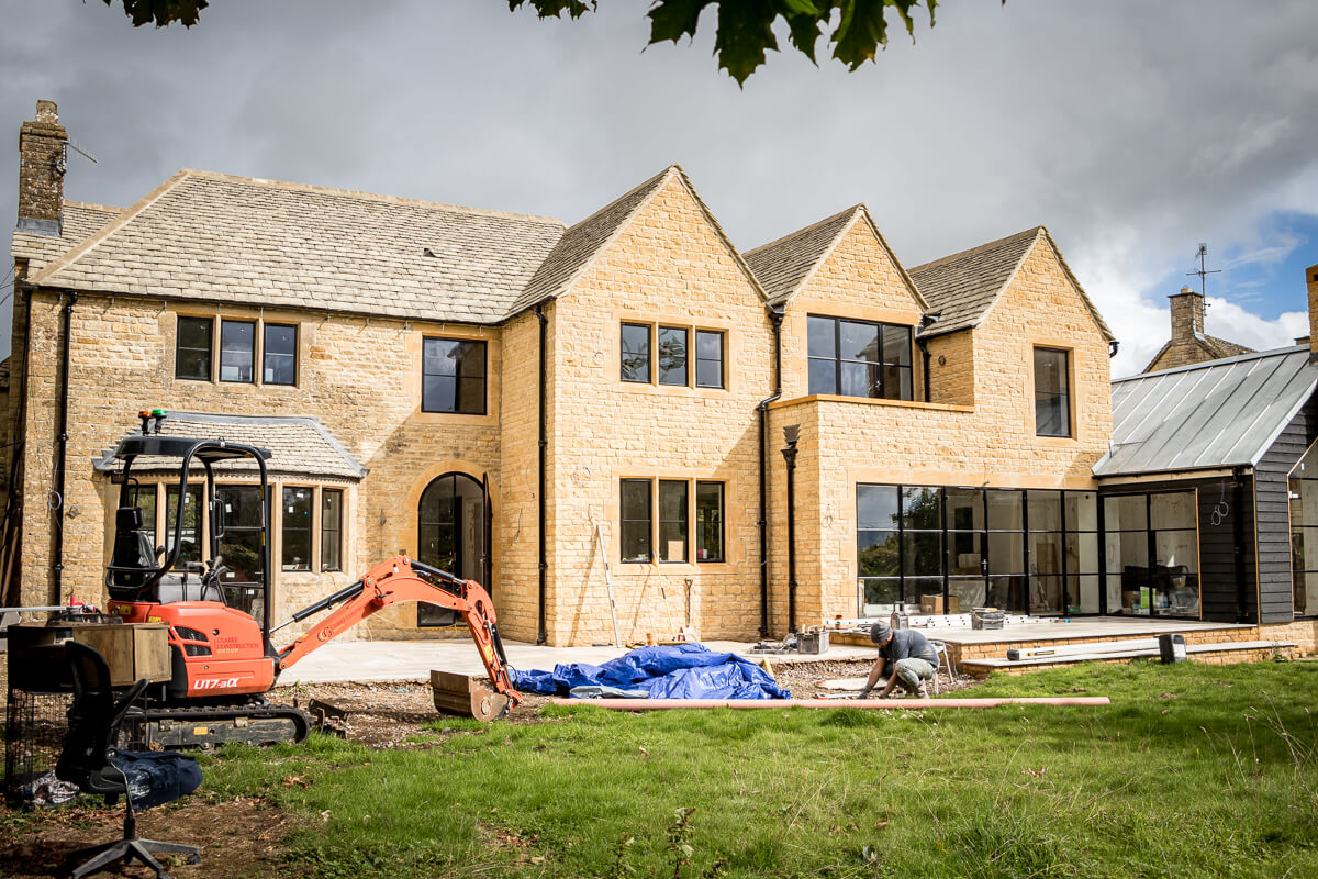 The new extension, with its vaulted ceilings, oak trusses, and expansive glazing, is now fully plastered and awaiting final decoration. Externally, the façade and rooflines are complete, giving the home a timeless and beautifully balanced appearance.
