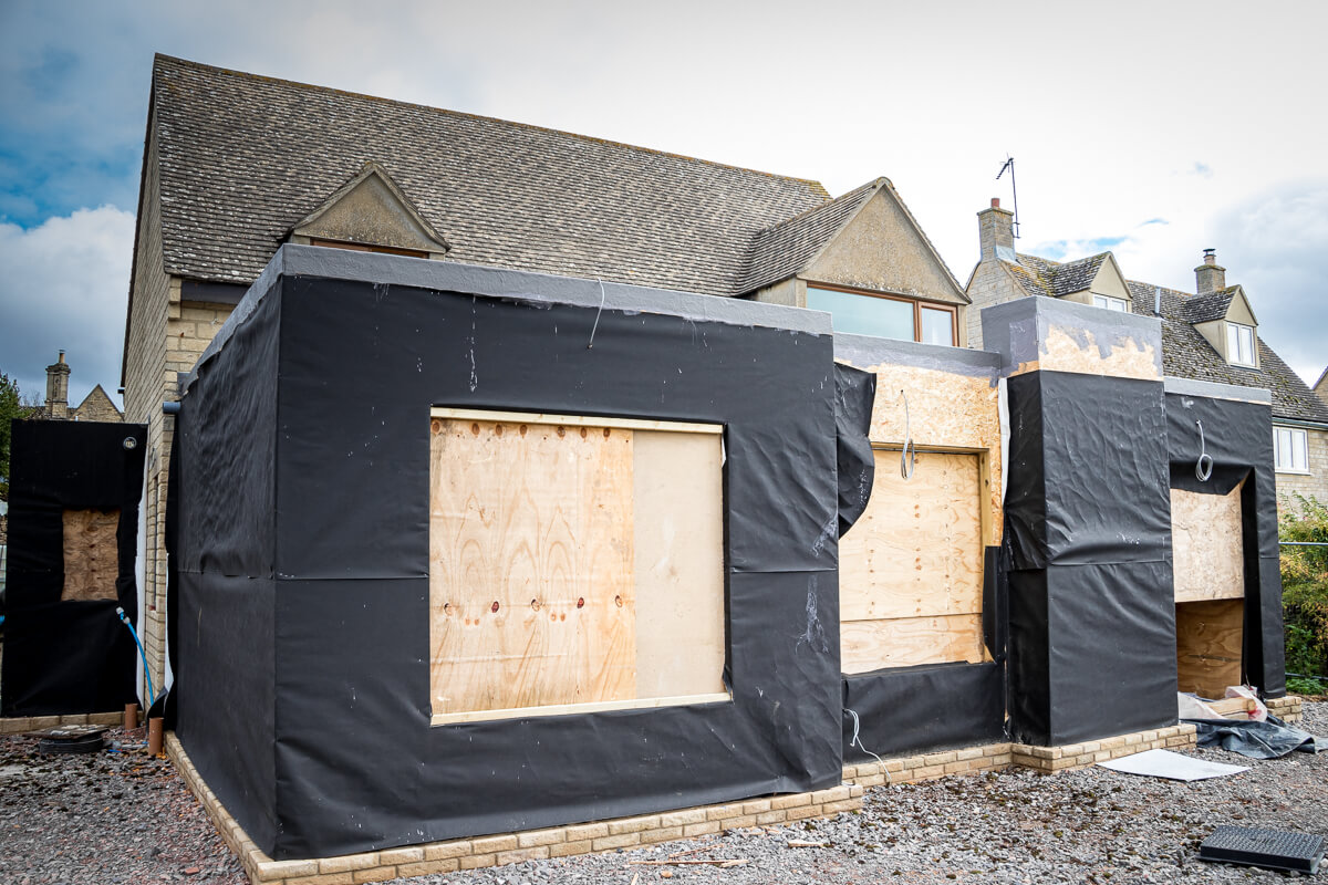 Externally, the modern extension at the rear has reached a key milestone. The structure is now fully wrapped in a high-performance weather-resistant membrane, acting as a protective envelope while we prepare for the final aesthetic finish. This wrap provides the ideal substrate for the bespoke cedar cladding, which will soon be installed to provide a striking, natural contrast to the existing architecture.