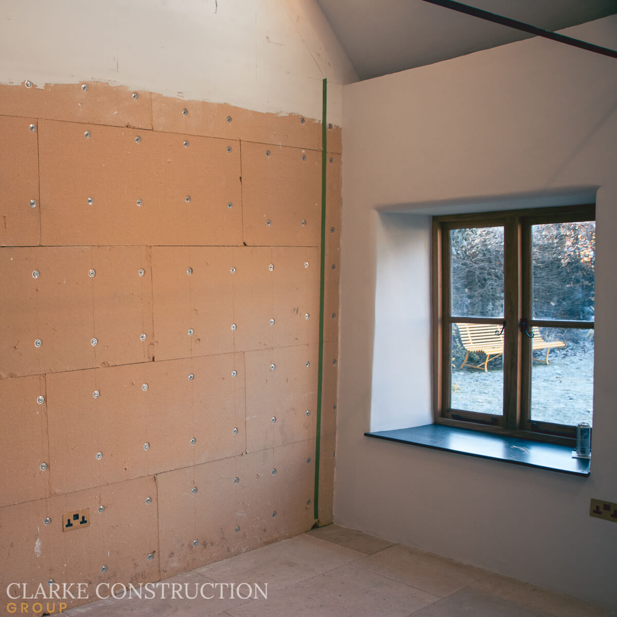 The unfinished rear wall shows some of the techniques we have to use due to the building’s listed status. Instead of plasterboard we use special wood fibre boards. Once our decorators have finished though you’d never know the difference.