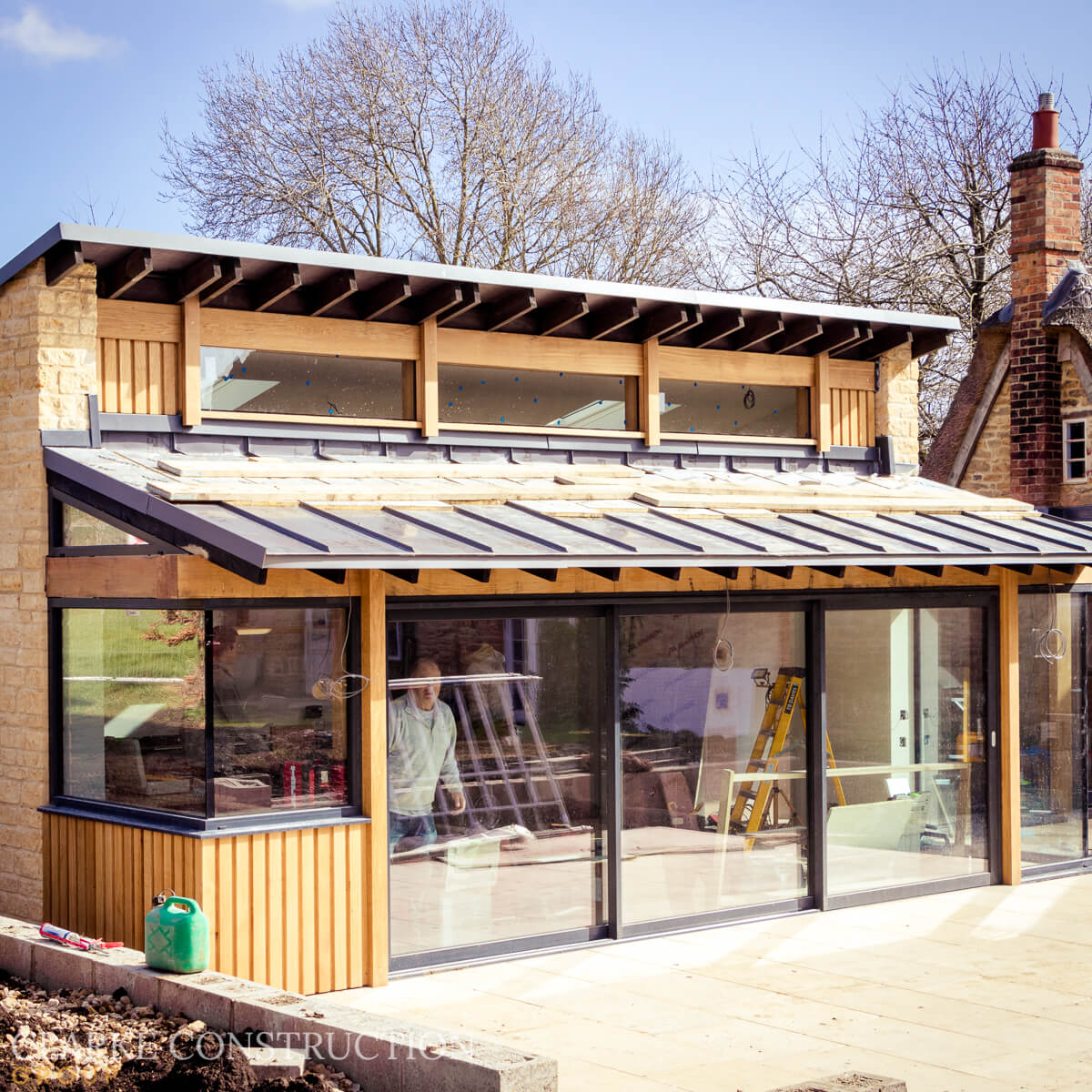 It's been quite a journey since our last visit to this site. Externally, the extension is complete, with wood, glass, and stone elements blending together seamlessly. The team is currently in the process of fitting the kitchen, which features a stunning wood topper for the island unit. This contemporary project boasts some remarkable architectural lines that create a fascinating contrast to the existing listed building.