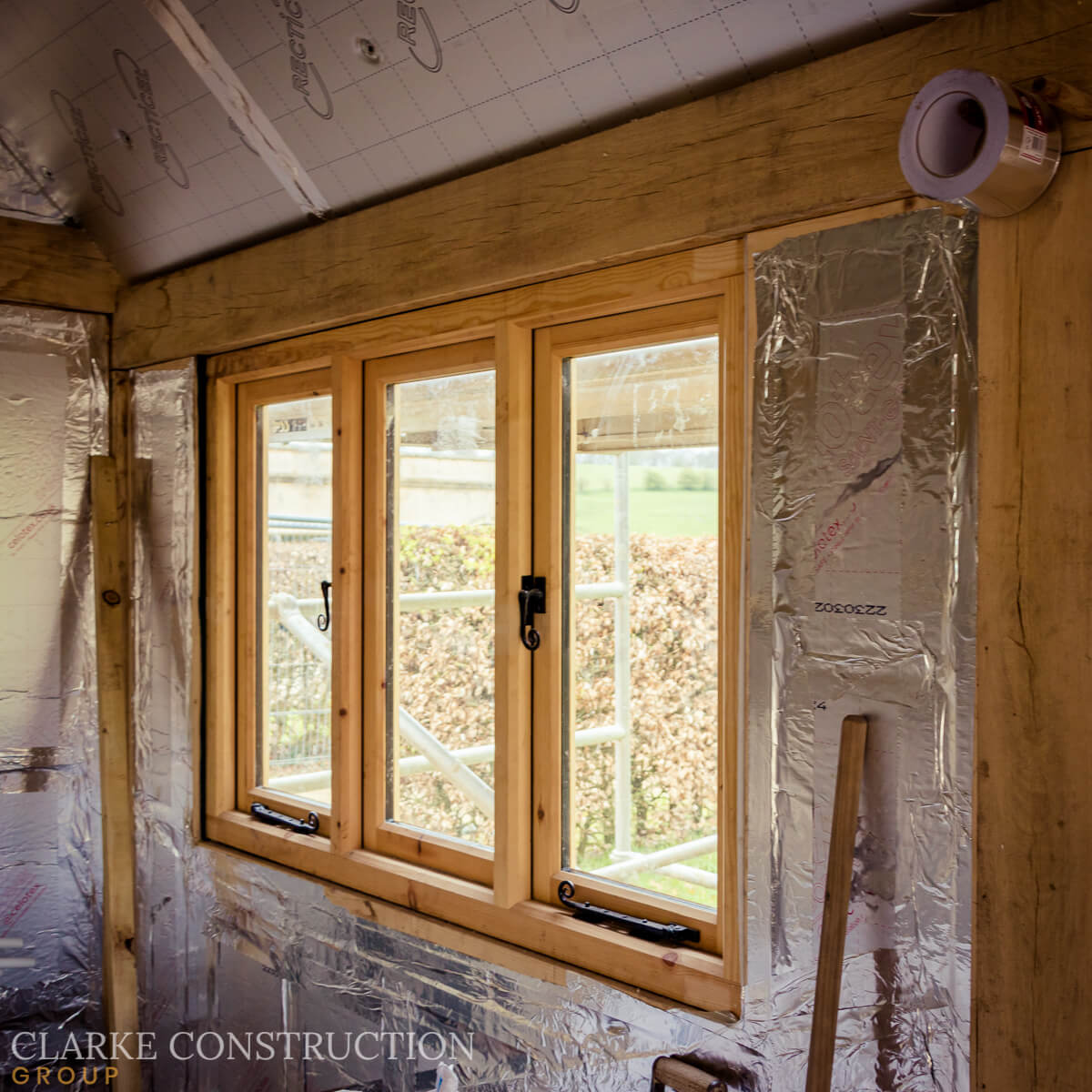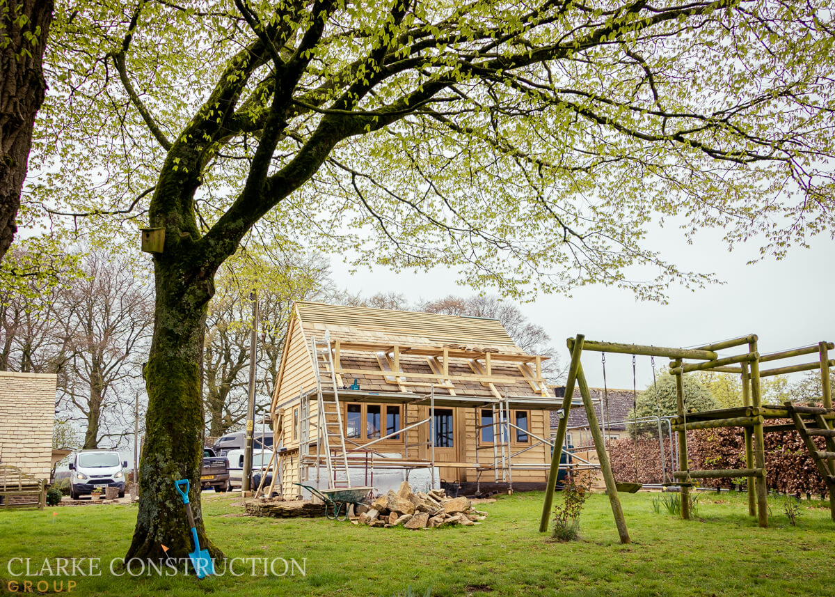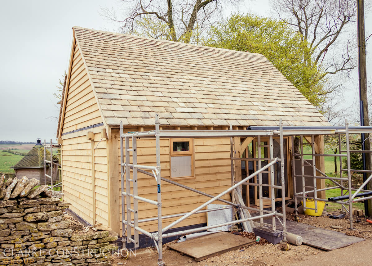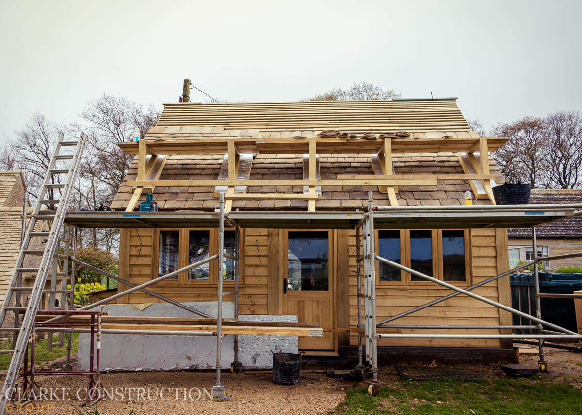The construction of the structure is now complete, boasting the charm and durability of a traditional timber frame. The exterior has been meticulously clad with timber, giving the office a warm and inviting aesthetic. Windows and doors have been installed, flooding the space with natural light and providing a seamless connection to the surrounding garden.