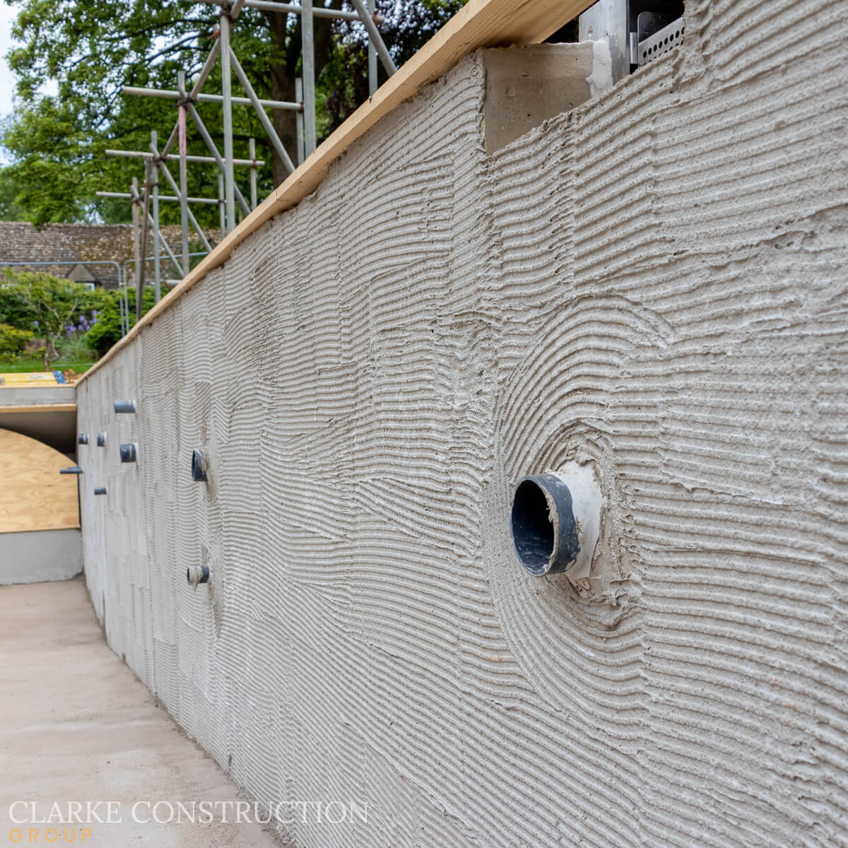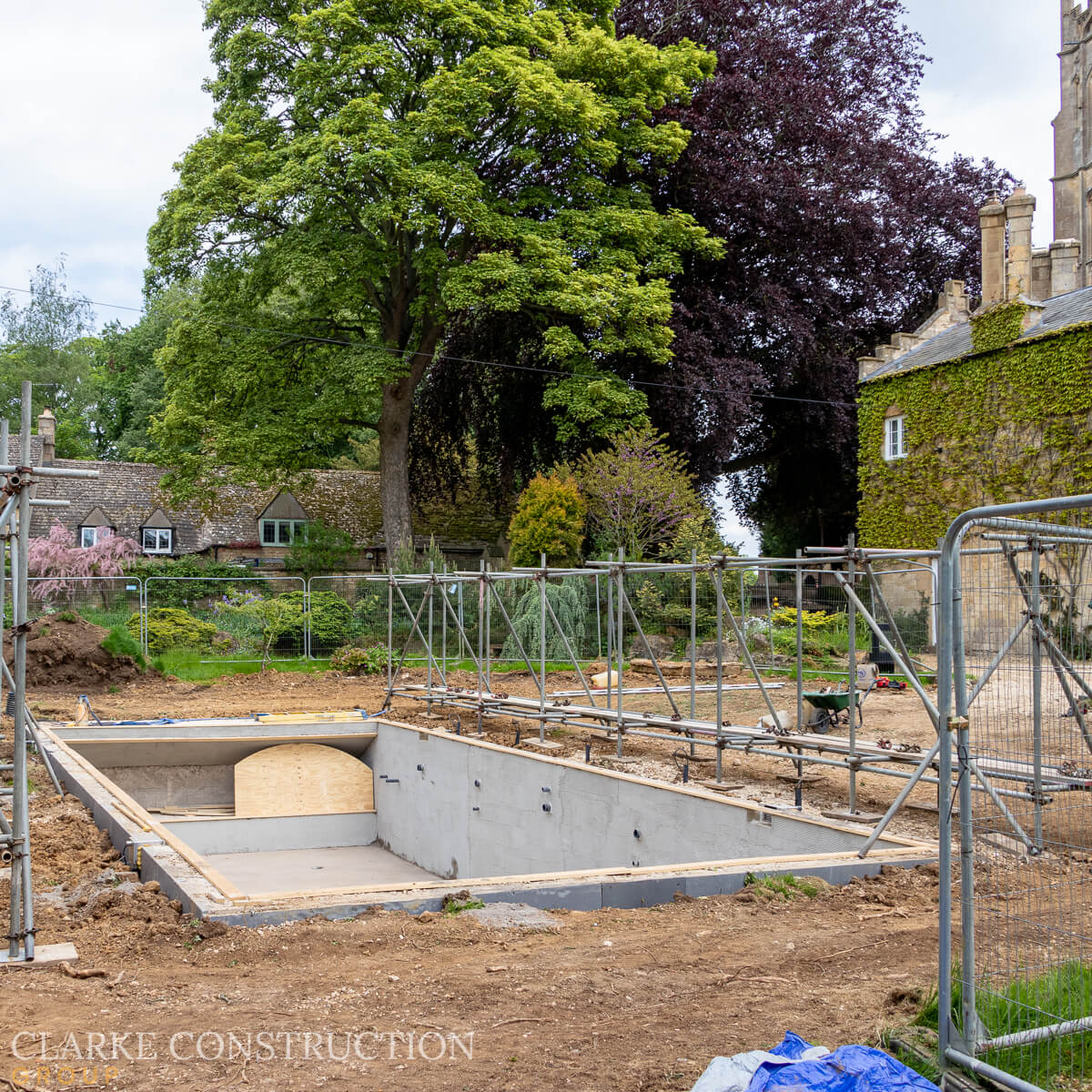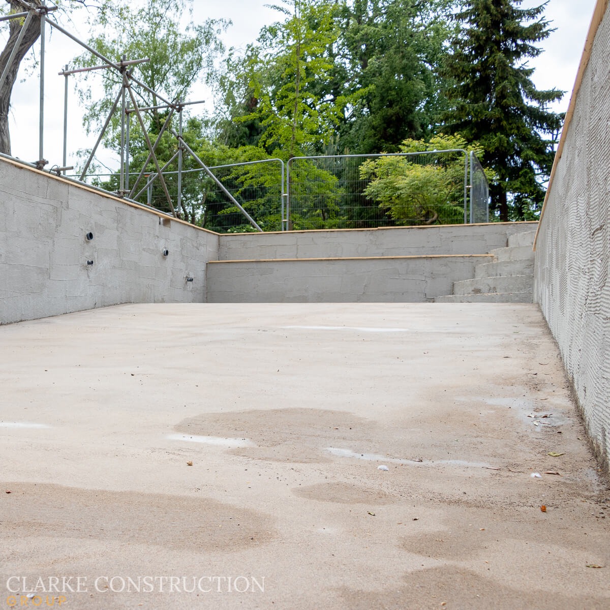 As we enter the next phase of construction, attention is now focused on perfecting the pool's finished surfaces. To safeguard the project from inclement weather, a scaffold tent is currently being erected, providing a protective cover that allows our team to work diligently while shielding the pool from the elements.