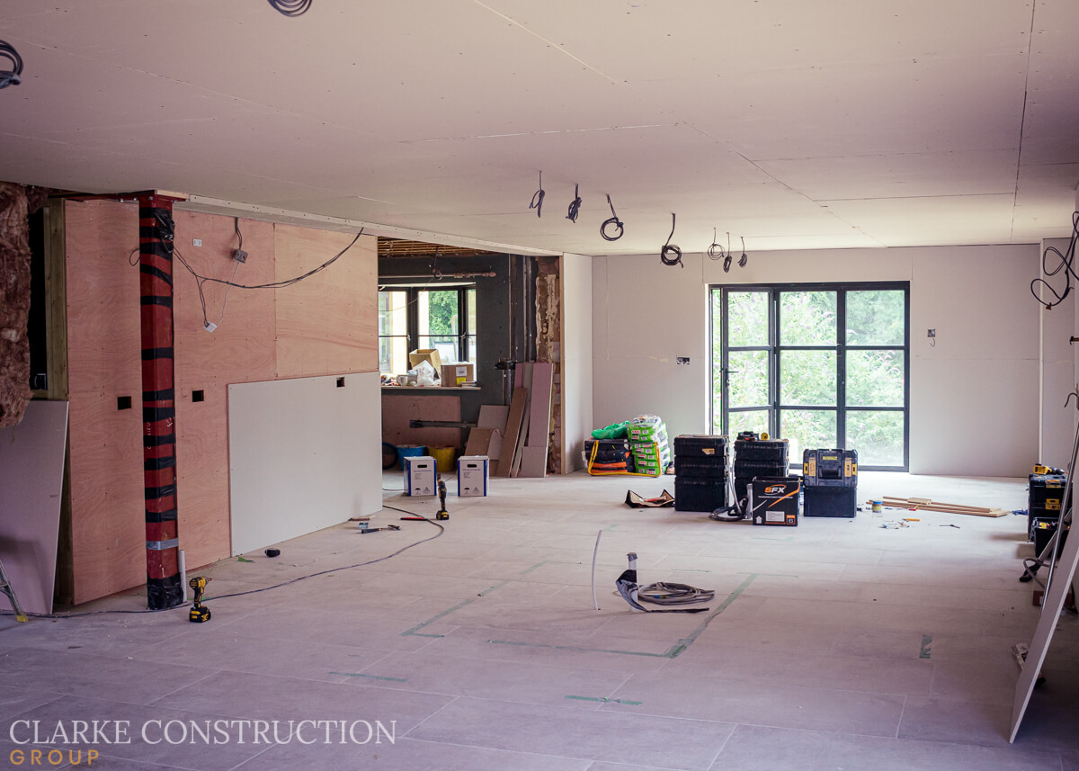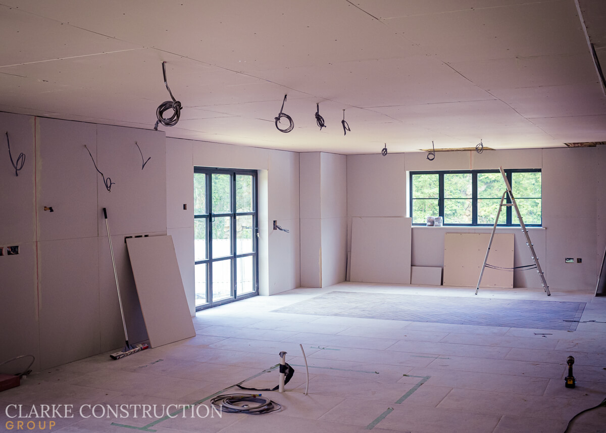 The kitchen has come to life with the completion of its stone flooring, and now the walls and ceilings are being skillfully plasterboarded, creating the foundation for a truly remarkable space. Simultaneously, our talented electricians are working diligently to ensure the first fix for the kitchen, an intricate network of cables for an extensive lighting and electrical system, is meticulously in place.