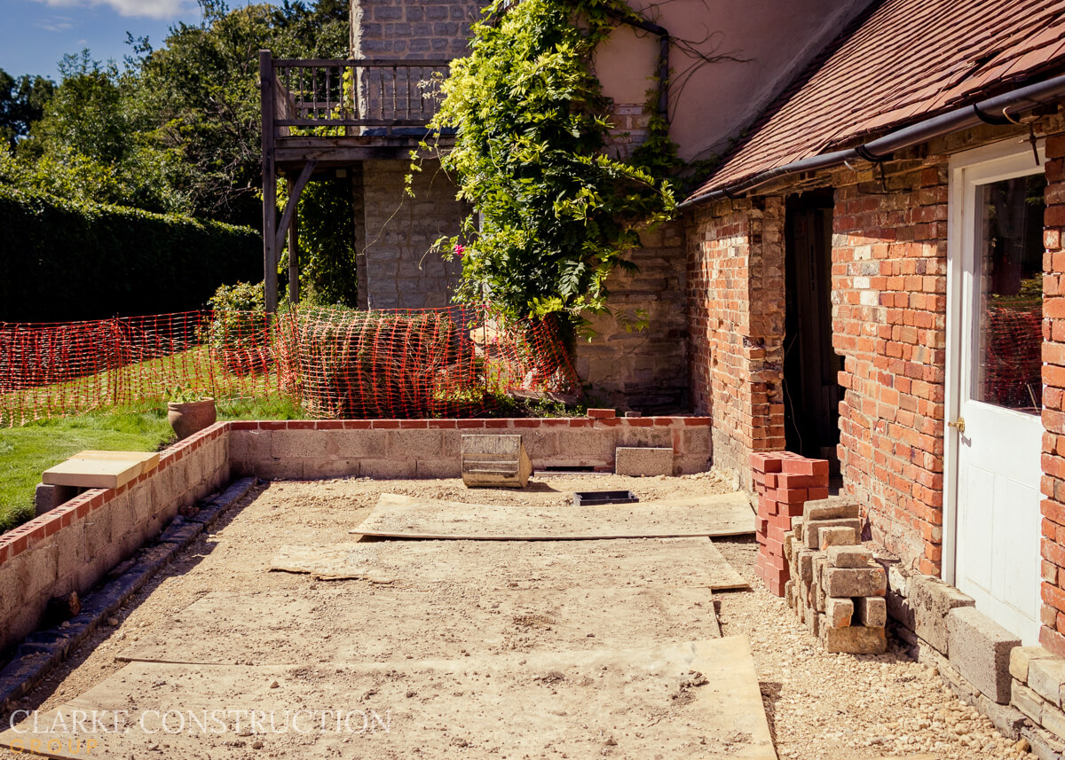 At the heart of this update lies the newly carved opening that marks the transition from indoor to outdoor. Once a humble kitchen window, this space now heralds the future - patio doors that will open onto a splendid new patio area. The foundations are set, ready to support the forthcoming patio and a retaining wall has been built to separate this new space from the lawns
