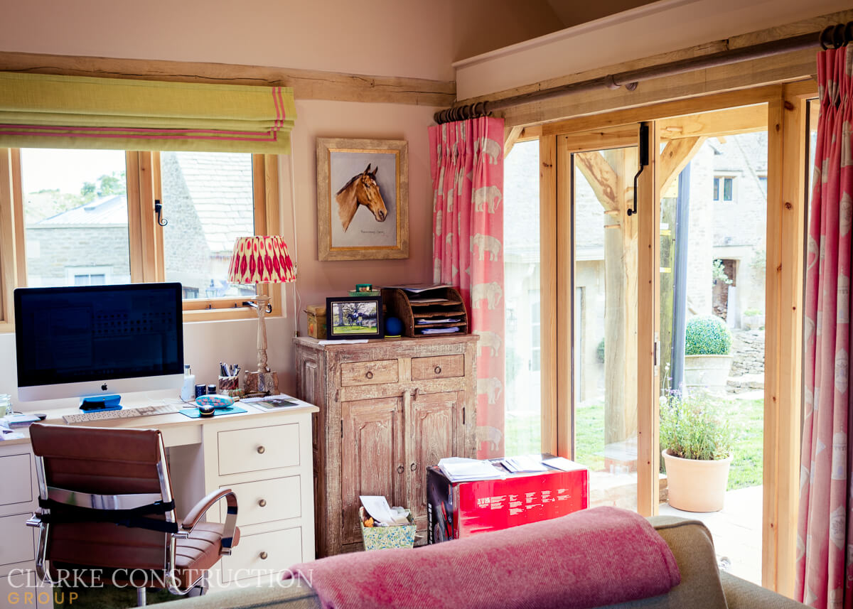 The first half of this enchanting space unfolds into a home office, a sanctuary for productivity amidst the serene Gloucestershire countryside. The expanse easily accommodates two desks, poised by windows that frame nature's tableau, inviting inspiration and focus.