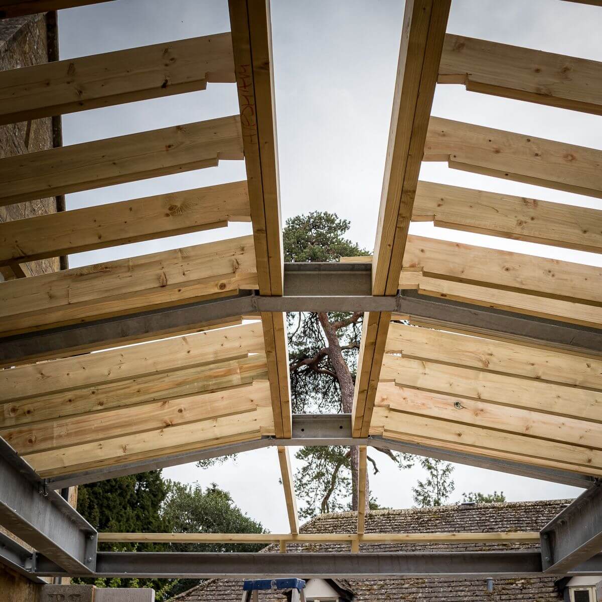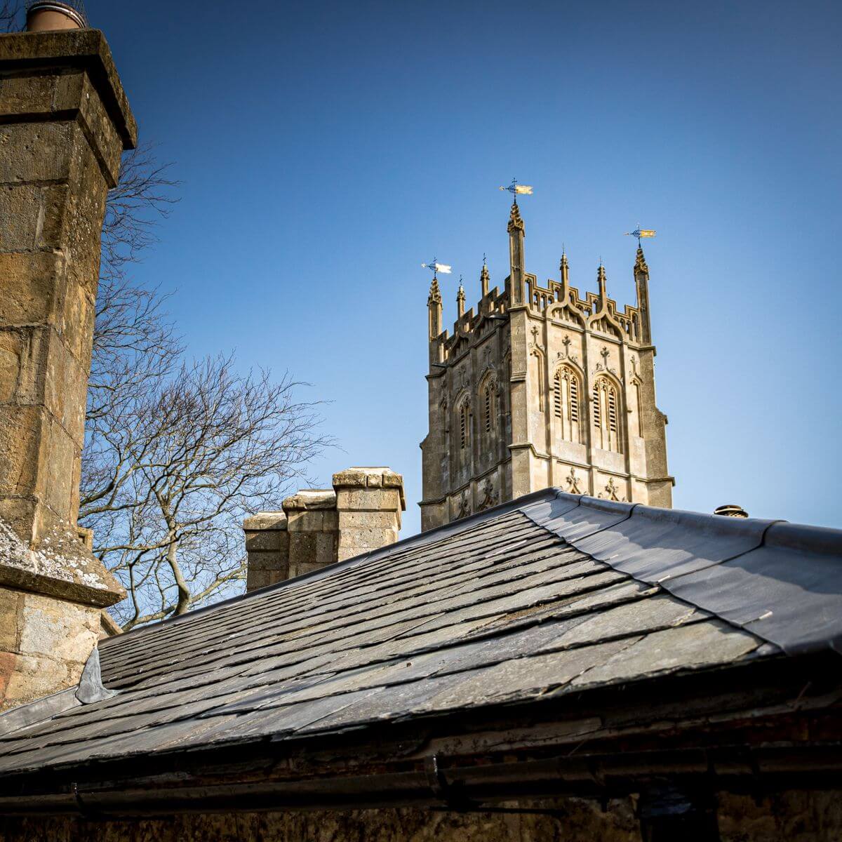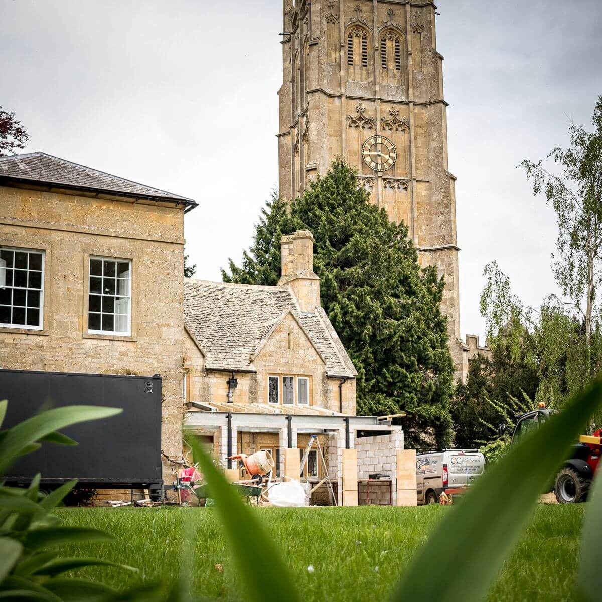 One of the centrepieces of the renovation is the bespoke single-storey kitchen extension: a glass-fronted, Cotswold stone structure filled with light and warmth. Custom cabinetry, marble worktops, and slim-framed glazing come together to create a space that’s both contemporary and timeless, allowing modern family life to unfold comfortably within the context of a historic building.